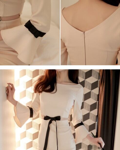 ワンピース 膝丈 ひざ丈 ミディアム丈 袖あり 長袖 フレアスリーブ ラウンドネック スリム タイト フリル リボン ベルト ウエストマーク バックスリット 綿 大人可愛い きれいめ シンプル 大人 上品 こなれ感 エレガント フォーマル 無地 春 夏 秋 冬 オールシーズン 10代 20代 30代 通勤 デート お出かけ 女子会 パーティー イベント レストラン コーデ スタイル モテ S M L XL オフホワイト コットン
