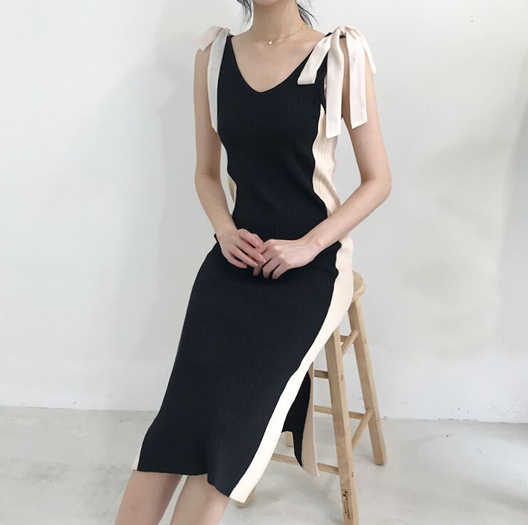 ワンピース レディース 膝下 ミモレ丈 ノースリーブ Vネック スリム タイト 細身 ストレート Iライン リボン サイドスリット スリット リブ リブニット 大人可愛い きれいめ 上品 お洒落 おしゃれ 主役級 存在感 大人 シンプル オルチャン 韓国 ファッション オシャレ ママ お出かけ 女子会 デート 普段使い 10代 20代 30代 40代 学生 お出かけ 女子会 パーティー イベント 二次会 インスタ映え ベージュ ブラック 黒