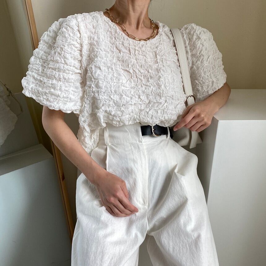 ボリューム感のあるパフスリーブが可愛いトップス ハイウエストボトムとの相性抜群◎ 【カラー】 ホワイト グレー ※モニターの仕様や、角度によって多少色合いが異なる場合がございます。 【サイズ (cm) 】ワンサイズ 着丈: 57 バスト: 87 肩幅: 34 袖丈: 26 ※サイズは平置きで測定しております。測り方や位置、素材の性質によりサイズに1-4cm程の誤差が生じる場合がございます。 【商品について】 ・こちらの商品は海外お取り寄せ商品です。 ・お手元に到着するまでに10-25日程度お時間をいただいておりますが、さらにお時間がかかってしまう場合や、欠品や不具合などにより商品をご用意できずご注文をキャンセルとさせていただく場合もございます。予めご了承下さいませ。 ・商品はすべて検品を行なった上で発送しております。到着後は、できるだけ早めに商品の状態をご確認願います。 ・海外製品のため日本製よりも縫製や糸の始末が甘い、微細なほつれ、匂いや微細な汚れなどといった場合がございます。ご理解、ご了承いただけますようお願いいたします。 ・万が一、初期不良や誤納品がございましたら、商品到着より5日以内にお知らせ下さい。誠意を持って早急に対応させていただきます。 【返品について】 ご注文確定後のキャンセルや内容変更はお受けすることができません。 不良品または誤納品の場合を除き、返品・交換はお受けできませんのでご了承ください。 何かご不明な点などがございましたら、お気軽にお問い合せくださいませ。 ts-310