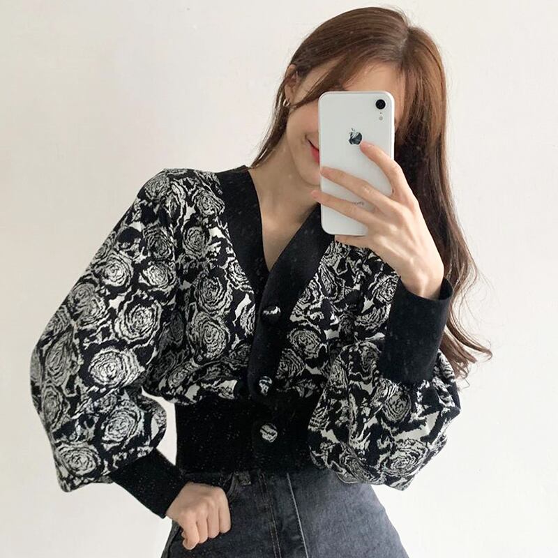 トップス カットソー 花柄 カーディガン 袖あり 長袖 ボリューム袖 きれいめ シンプル カジュアル 大人 上品 おしゃれ お洒落 かっこいい レトロ 大人可愛い 大人女子 抜け感 春 秋 ハロウィン クリスマス バレンタイン 2021 20代 30代 女性用 ママ 女の子 ビジネス OL 通勤 デート お出かけ 公園デビュー 女子会 お泊まり 休日 イベント リゾート 旅行 着回し 普段使い 韓国 韓国系 オルチャン ファッション 黒 ピンク