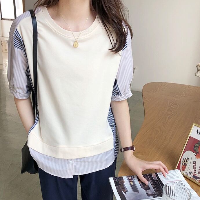 トップス Tシャツ シャツ ブラウス 白シャツ 白トップス 袖あり 5分袖 五分袖 Uネック ラウンドネック 襟なし 切り替えデザイン 薄手 0 かわいい 大人可愛い きれいめ カジュアル 大人 上品 おしゃれ お洒落 レトロ 大人可愛い こなれ感 ラブリー キュート ガーリー 抜け感 柄 ストライプ 0 夏 2021 20代 30代 女性用 ママ 女の子 デート お出かけ 公園デビュー 女子会 お泊まり 休日 イベント リゾート 旅行 海 プール 着回し 普段使い 韓国 韓国系 オルチャン