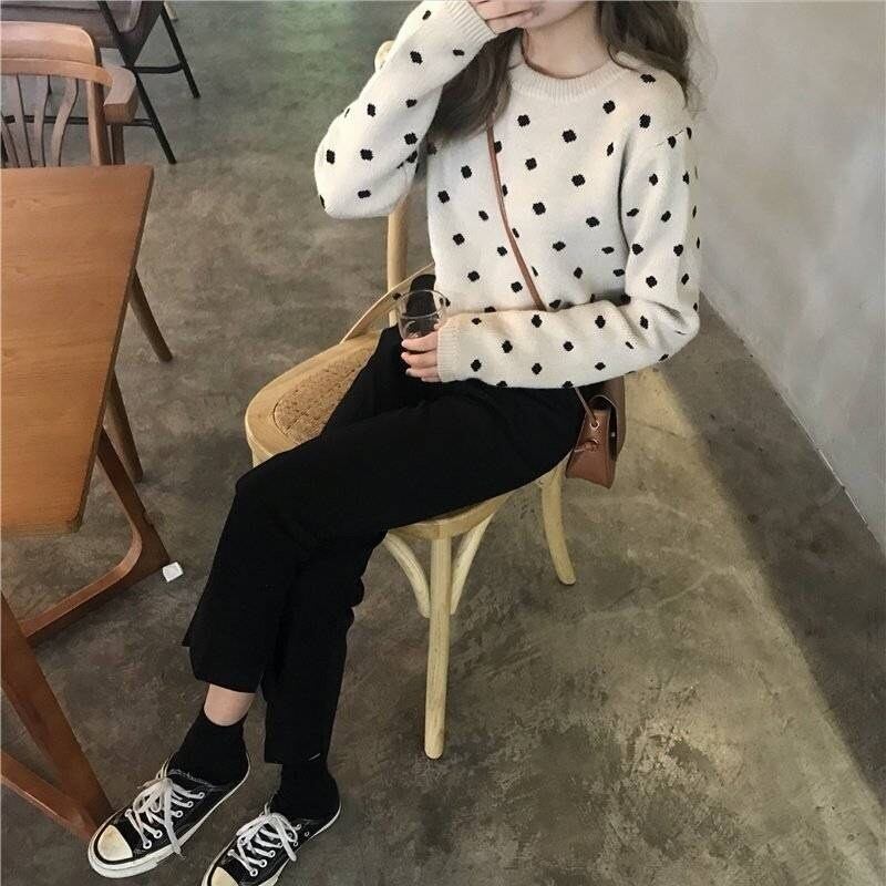 トップス ニットソー セーター 白トップス 袖あり 長袖 Uネック ラウンドネック 襟なし 切り替えデザイン ニット 薄手 かわいい きれいめ シンプル カジュアル 大人 上品 おしゃれ お洒落 かっこいい レトロ 大人可愛い 大人女子 主役級 存在感 柄 ドット柄 0 秋 冬 ハロウィン クリスマス バレンタイン 2021 10代 20代 30代 女性用 ママ 女の子 デート お出かけ 公園デビュー 女子会 お泊まり 休日 旅行 着回し 普段使い 韓国 韓国系 オルチャン ファッション コーデ