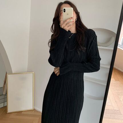 ロングニットワンピース ワンピース ワンピドレス ロング ロング丈 袖あり 長袖 ラウンドネック スリム 細身 Iライン プリーツ ハイウエスト ポリエステル かわいい 大人可愛い きれいめ シンプル カジュアル 大人 おしゃれ お洒落 大人可愛い 大人女子 こなれ感 ラフ ラブリー キュート ガーリー 個性的 クール 主役級 存在感 無地 春 秋 10代 20代 30代 レディース 学生 通学 デート お出かけ 女子会 休日 着回し 普段使い 韓国 韓国系 サイズ S M L ゆったり 黒 ブラック