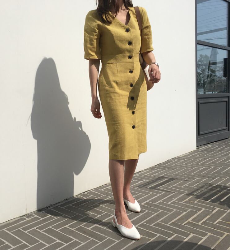 ネック半袖ワンピース ワンピース ワンピドレス 膝丈 ひざ丈 膝下 袖あり 半袖 Vネック スリム 細身 Iライン 前開き かわいい 大人可愛い きれいめ シンプル カジュアル 大人 おしゃれ お洒落 大人可愛い 大人女子 こなれ感 ラフ ラブリー キュート ガーリー 主役級 存在感 無地 春 夏 10代 20代 30代 レディース 学生 通学 デート お出かけ 女子会 休日 普段使い 韓国 韓国系 サイズ S M L XL 黄色 イエロー