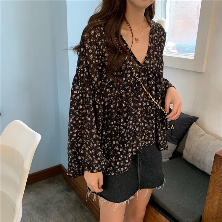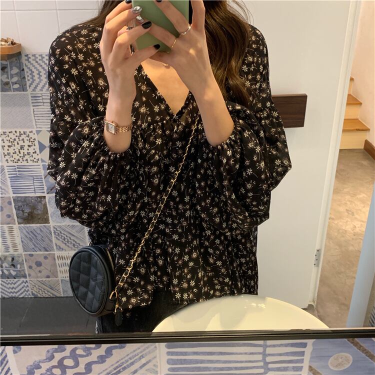 トップス ブラウス ミディアム丈 袖あり 長袖 ボリューム袖 Vネック 襟付き ストレート ワイド シフォン 薄手 かわいい 大人可愛い シンプル おしゃれ レトロ 大人可愛い 大人女子 こなれ感 キュート ガーリー ルーズ 小花柄 春 夏 2021 10代 20代 30代 レディース デート お出かけ 女子会 休日 ガーデン カフェ ショッピング 観光 着回し 普段使い 韓国 スタイル モテ 新作 安い インスタ映え デートコーデ フリーサイズ ブラック アプリコット