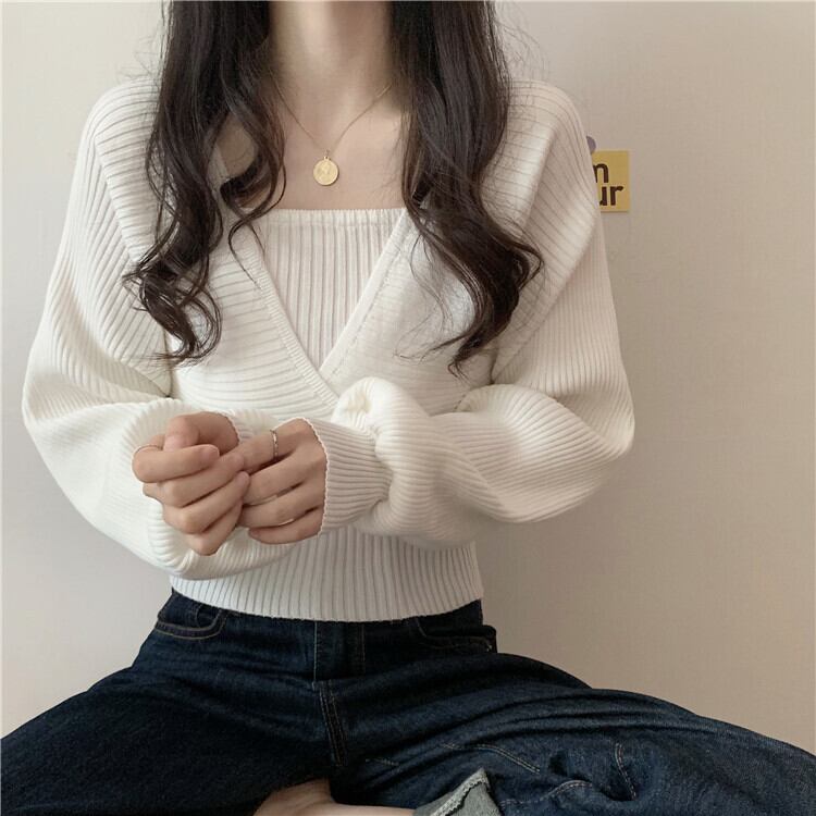 トップス セーター ショート丈 袖あり 長袖 ボリューム袖 Vネック 襟付き ストレート ニット 薄手 かわいい 大人可愛い シンプル 大人 おしゃれ かっこいい 大人可愛い 大人女子 個性的 クール セクシー 無地 春 秋 冬 クリスマス バレンタイン 2021 10代 20代 レディース デート お出かけ 女子会 休日 パーティー カフェ ショッピング 着回し 普段使い 韓国系 ファッション モテ 新作 プチプラ インスタ映え フリーサイズ 色展開 ホワイト ブラック