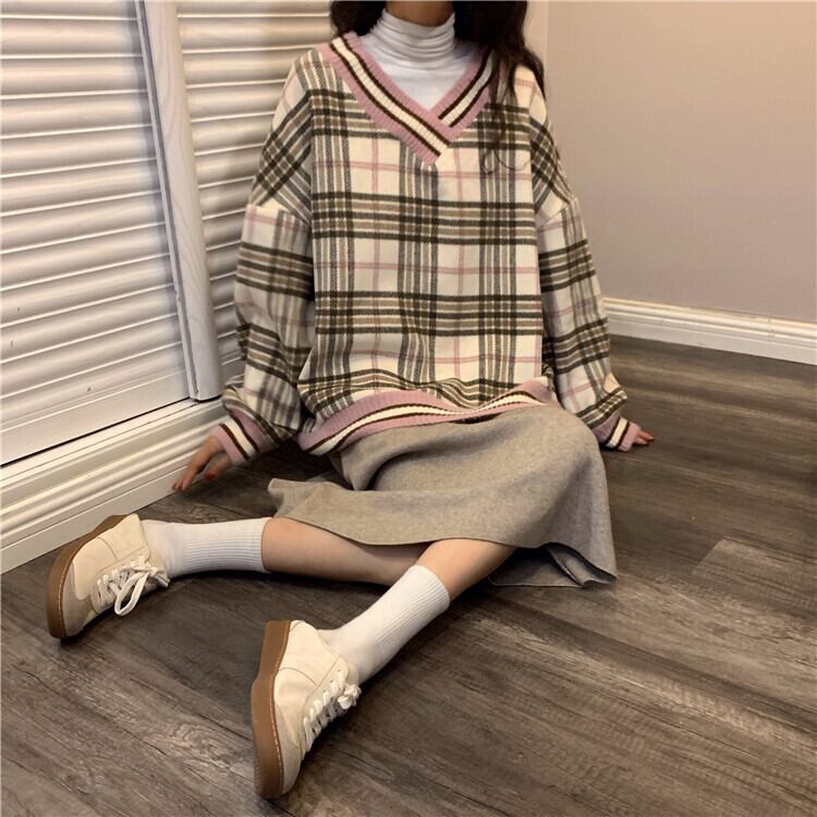 トップス セーター ミディアム丈 袖あり 長袖 Vネック 襟付き ストレート ニット かわいい カジュアル おしゃれ かっこいい 大人可愛い こなれ感 ラフ ボーイッシュ キュート ガーリー ルーズ 柄 チェック柄 春 秋 2021 10代 20代 レディース 学生 通学 デート お出かけ 女子会 休日 旅行 カフェ ショッピング 観光 着回し 普段使い 韓国系 ファッション モテ 新作 インスタ映え デートコーデ フリーサイズ 色展開 ブルー ピンク