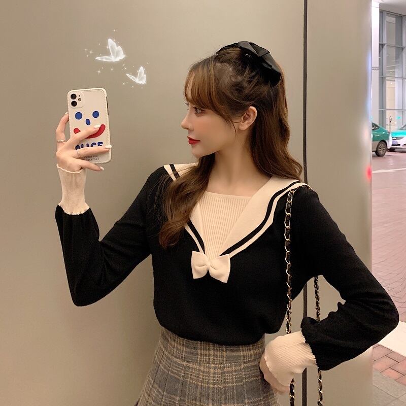 トップス セーター ミディアム丈 袖あり 長袖 襟付き セーラー襟 ストレート リボン ニット かわいい 大人可愛い きれいめ おしゃれ 大人可愛い ラブリー キュート ガーリー 存在感 無地 秋 冬 ハロウィン クリスマス 2020 10代 20代 レディース 学生 デート お出かけ 休日 イベント カフェ ショッピング 着回し 普段使い オルチャン ファッション モテ インスタ映え デートコーデ スクールテイスト XL 2XL 3XL 4XL 大きいサイズ ブラック