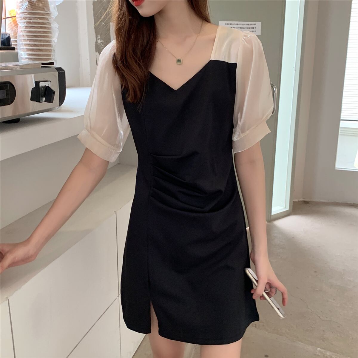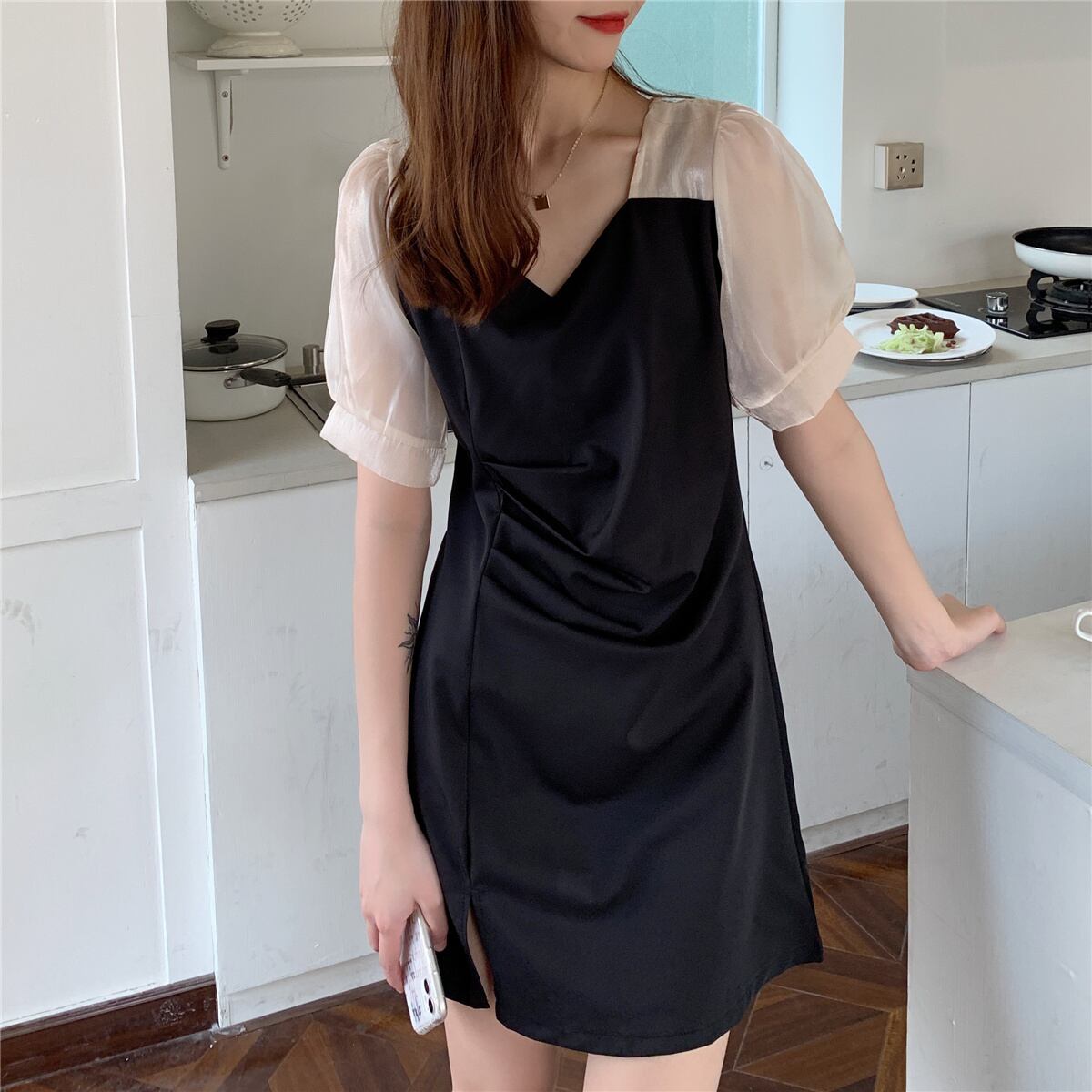 袖部分の透け感がお洒落! スリット入りでセクシーなミニ丈ワンピース! 色展開 ブラック サイズ M L XL 2XL 3XL 4XL サイズ(cm) M /着丈 85 /バスト 92 /肩幅 32 /袖丈 29 L /着丈 86 /バスト 96 /肩幅 33 /袖丈 29.5 XL /着丈 87 /バスト 100 /肩幅 34 /袖丈 30 2XL /着丈 88 /バスト 106 /肩幅 35.5 /袖丈 30.5 2XL /着丈 89 /バスト 112 /肩幅 37 /袖丈 31 4XL /着丈 90 /バスト 120 /肩幅 38.5 /袖丈 31.5 ※モニターの仕様や、角度によって多少色合いが異なる場合がございます。 ※サイズは平置きで測定しております。測り方や位置、素材の性質によりサイズに1-4cm程の誤差が生じる場合がございます。 【商品について】 ・こちらの商品は海外お取り寄せ商品です。 ・お手元に到着するまでに10-25日程度お時間をいただいておりますが、さらにお時間がかかってしまう場合や、欠品や不具合などにより商品をご用意できずご注文をキャンセルとさせていただく場合もございます。予めご了承下さいませ。 ・商品はすべて検品を行なった上で発送しております。到着後は、できるだけ早めに商品の状態をご確認願います。 ・海外製品のため日本製よりも縫製や糸の始末が甘い、微細なほつれ、匂いや微細な汚れなどといった場合がございます。ご理解、ご了承いただけますようお願いいたします。 ・万が一、初期不良や誤納品がございましたら、商品到着より5日以内にお知らせ下さい。誠意を持って早急に対応させていただきます。 【返品について】 ご注文確定後のキャンセルや内容変更はお受けすることができません。 不良品または誤納品の場合を除き、返品・交換はお受けできませんのでご了承ください。 何かご不明な点などがございましたら、お気軽にお問い合せくださいませ。 op-817