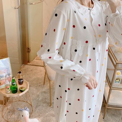 ワンピース ルームウェア パジャマ 寝巻き ナイトウェア ミモレ ミモレ丈 ロング ロング丈 長袖 クルーネック 襟付き ストレート レース フリル リボン かわいい 大人可愛い カジュアル ラフ ラブリー キュート ガーリー ドット柄 水玉 春 秋 10代 20代 30代 レディース ママ キッズ 女の子 お泊まり 普段使い お揃い 双子 韓国系 ファッション コーデ 楽ちん 体型カバー 送料無料 M L XL 2XL ホワイト