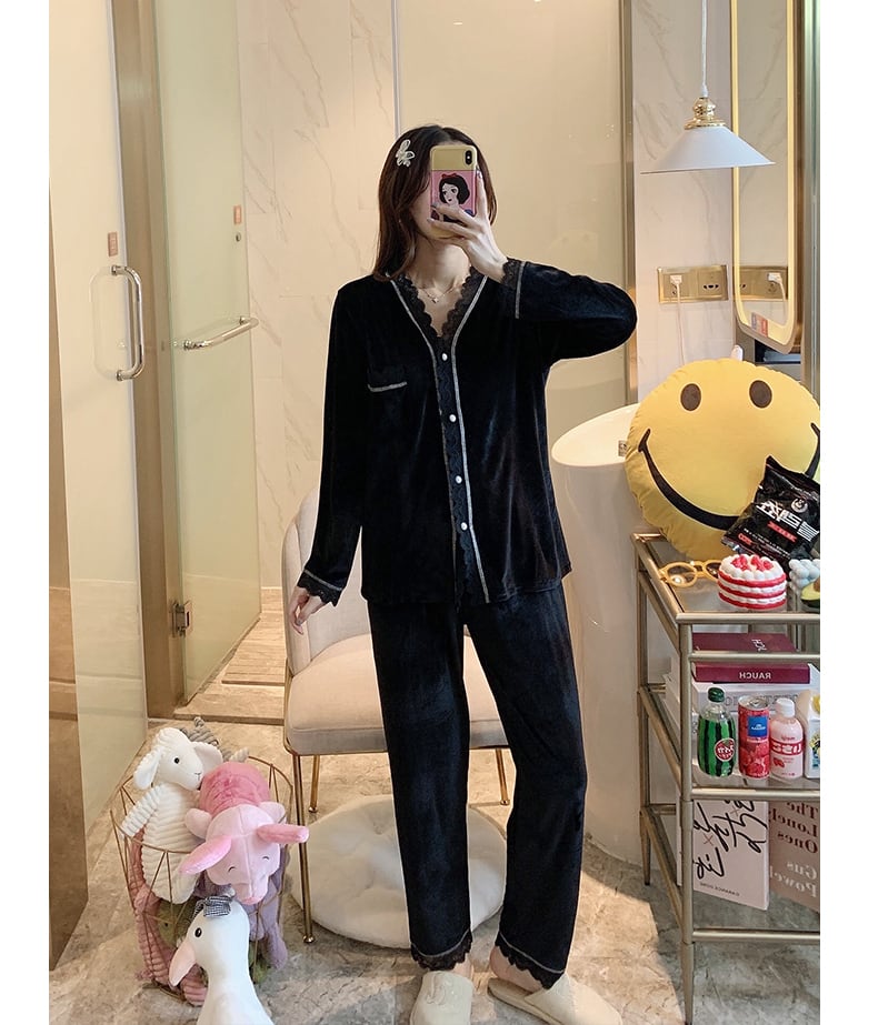 レースで縁取られた大人ガーリーな上下セットパジャマ。 光沢感あるベルベット生地を使用した一着です。 色展開 ブラック ピンク サイズ M L XL 2XL サイズ(cm) M /着丈 62 /バスト 92 /肩幅 38 /袖丈 54 /パンツ丈 91 L /着丈 64 /バスト 96 /肩幅 41 /袖丈 56 /パンツ丈 94 XL /着丈 66 /バスト 100 /肩幅 43 /袖丈 58 /パンツ丈 97 2XL /着丈 68 /バスト 104 /肩幅 45 /袖丈 58 /パンツ丈 100 ※モニターの仕様や、角度によって多少色合いが異なる場合がございます。 ※サイズは平置きで測定しております。測り方や位置、素材の性質によりサイズに1-4cm程の誤差が生じる場合がございます。 【商品について】 ・こちらの商品は海外お取り寄せ商品です。 ・お手元に到着するまでに10-25日程度お時間をいただいておりますが、さらにお時間がかかってしまう場合や、欠品や不具合などにより商品をご用意できずご注文をキャンセルとさせていただく場合もございます。予めご了承下さいませ。 ・商品はすべて検品を行なった上で発送しております。到着後は、できるだけ早めに商品の状態をご確認願います。 ・海外製品のため日本製よりも縫製や糸の始末が甘い、微細なほつれ、匂いや微細な汚れなどといった場合がございます。ご理解、ご了承いただけますようお願いいたします。 ・万が一、初期不良や誤納品がございましたら、商品到着より5日以内にお知らせ下さい。誠意を持って早急に対応させていただきます。 【返品について】 ご注文確定後のキャンセルや内容変更はお受けすることができません。 不良品または誤納品の場合を除き、返品・交換はお受けできませんのでご了承ください。 何かご不明な点などがございましたら、お気軽にお問い合せくださいませ。 rw-108