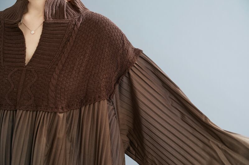 トップス ニットソー プルオーバー チュニック 長袖 ランタンスリーブ Vネック ワイド 切り替えデザイン ドッキング プリーツ 編み込み 異素材MIX 大人可愛い きれいめ カジュアル 大人 おしゃれ お洒落 レトロ 大人女子 こなれ感 ラフ ルーズ 個性的 存在感 無地 秋 冬 20代 30代 40代 50代 レディース ママ デート お出かけ 公園デビュー 女子会 お泊まり 休日 旅行 着回し 普段使い 韓国系 ファッション スタイル 楽ちん 暖かい 体型カバー 送料無料 ゆったり ゆる オーバー