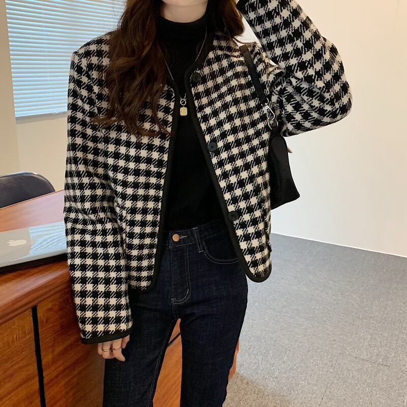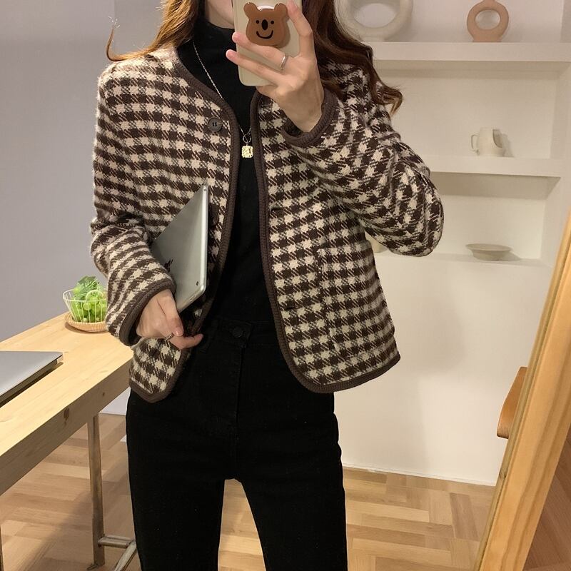 アウター レディース ジャケット レトロ ショート丈 長袖 柄 チェック 格子柄 春 秋 ポケット 前開き ボタン 大人可愛い きれいめ シンプル カジュアル 上品 おしゃれ お洒落 かっこいい 大人女子 こなれ感 クール モード系 エレガント 主役級 存在感 ブラック ブラウン 大人カラー フリーサイズ 10代 20代 30代 40代 50代 女性用 オフィス ビジネス OL 通勤 学生 通学 お出かけ 韓国 オルチャン ファッション コーデ スタイル モテ インスタ映え 送料無料