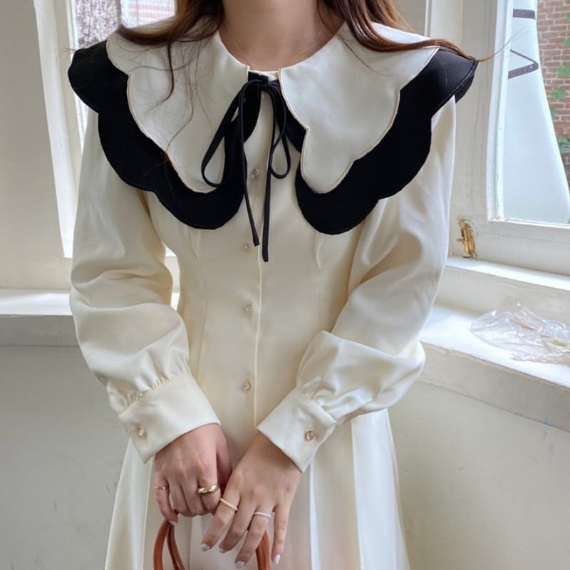 ワンピース シャツワンピース Aラインワンピース ひざ下 ミモレ丈 長袖 無地 春 秋 セミフレア Aライン 裾フレア ビック襟 ウエストマーク かわいい 大人可愛い 大人 上品 おしゃれ お洒落 レトロ 大人女子 こなれ感 ラブリー キュート ガーリー 個性的 エレガント 存在感 襟付き 黒 ブラック オフホワイト S M 10代 20代 30代 女性用 OL 通勤 学生 通学 デート お出かけ 女子会 パーティー イベント 旅行 謝恩会 二次会 双子 韓国系 オルチャン ファッション インスタ映え