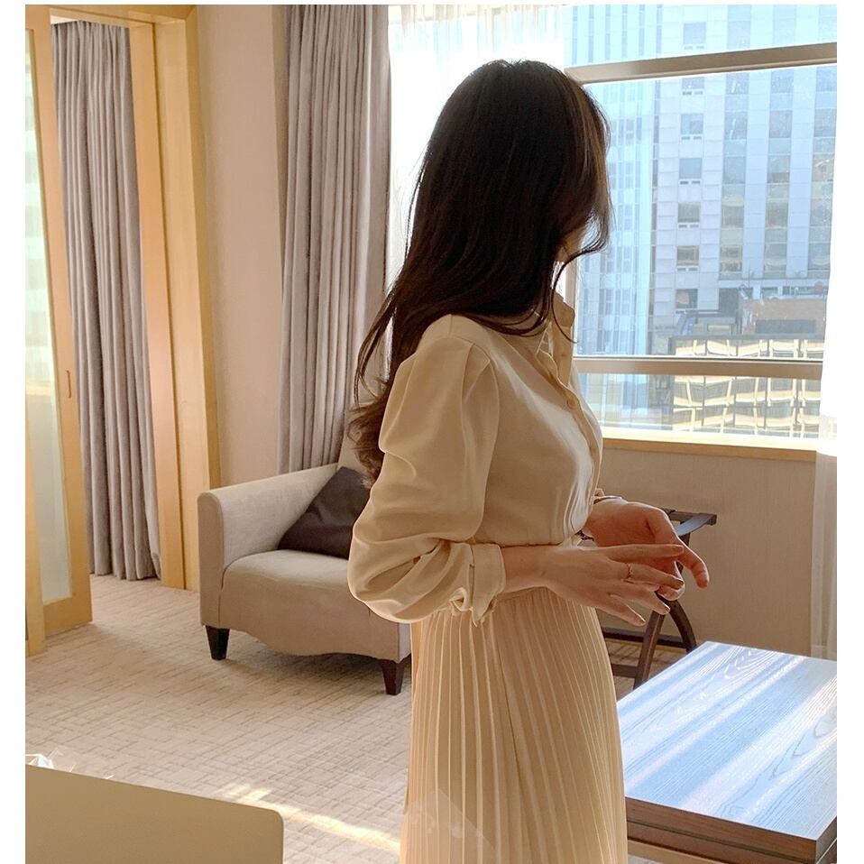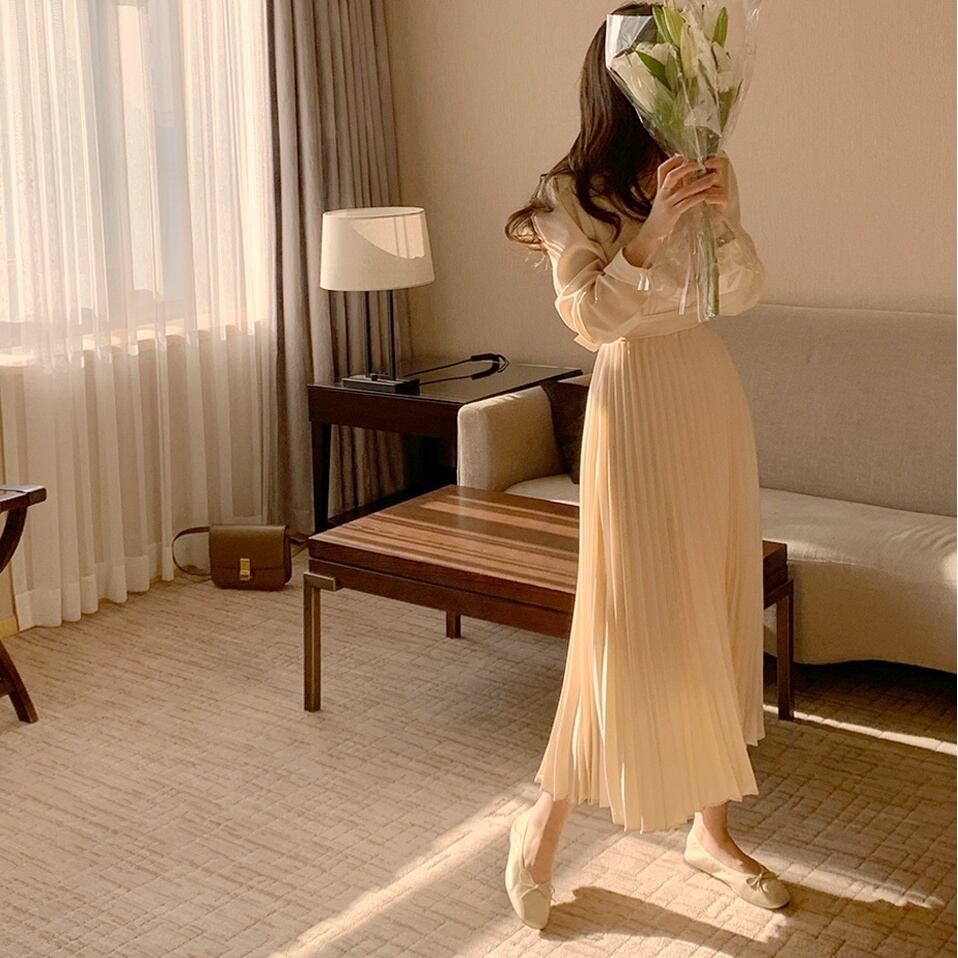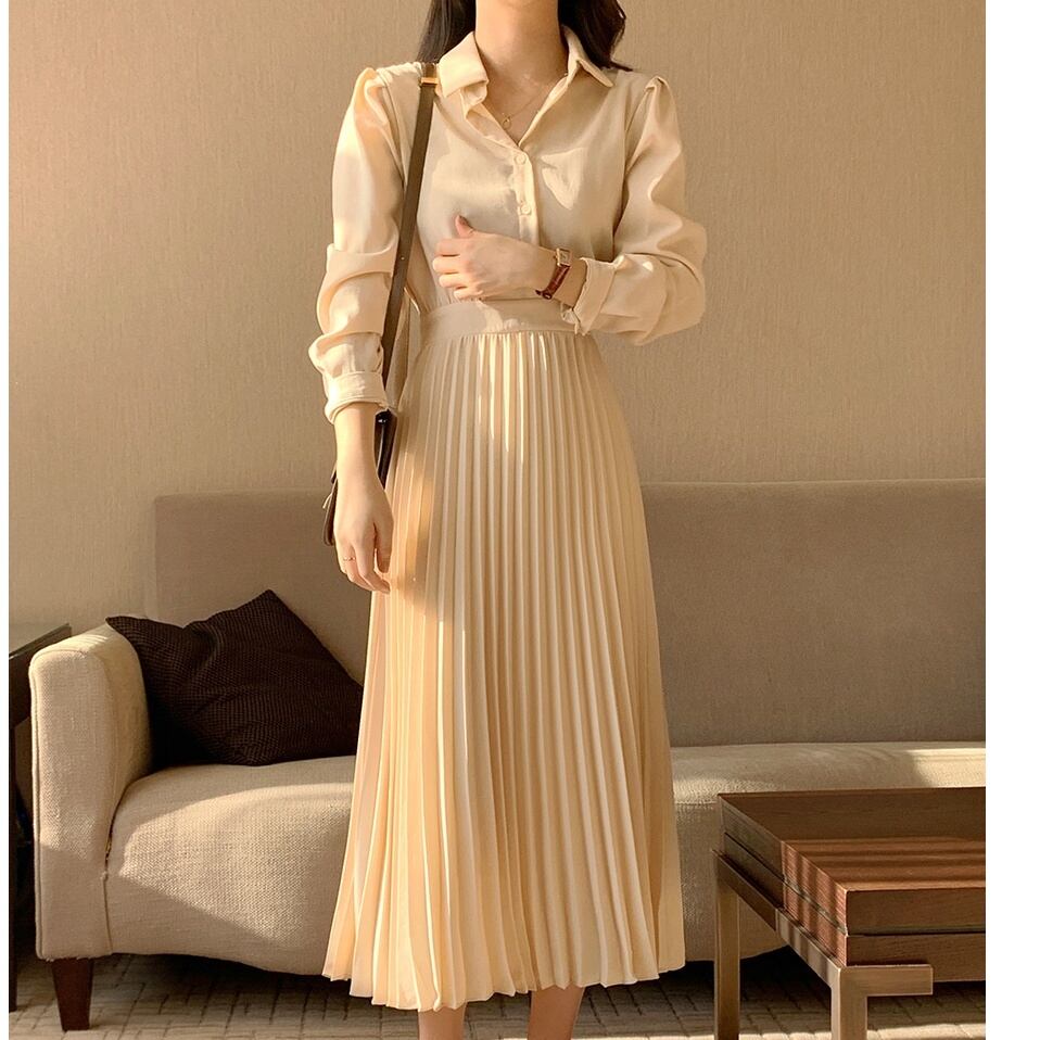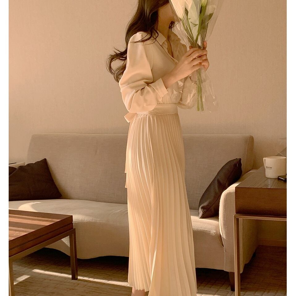 ワンピース レディース デート ロング ミドル丈 膝下 袖あり 長袖 襟付き セミフレア スリム Aライン プリーツ 切り替えデザイン ウエストマーク ベルト 伸縮性 かわいい シンプル カジュアル ラフ キュート ガーリー ルーズ 無地 春 秋 10代 20代 30代 学生 通学 デート お出かけ OL 通勤 公園デビュー 女子会 お泊まり 休日 旅行 着回し 普段使い お揃い 韓国 オルチャン ファッション コーデ 楽ちん モテ 送料無料 S M L XL アプリコット