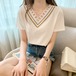 Vネックですっきりとしつつ、レースと刺繍で華やかに 1枚で着ても、ジャケットやカーディガンのインナーにも 色展開 ホワイト ブラック グリーン サイズ S M L サイズ(cm) S /バスト 94 /肩幅 37 /着丈 61 /袖丈 19 M /バスト 98 /肩幅 38 /着丈 62 /袖丈 20 L /バスト 102 /肩幅 39 /着丈 63 /袖丈 21 ※モニターの仕様や、角度によって多少色合いが異なる場合がございます。 ※サイズは平置きで測定しております。測り方や位置、素材の性質によりサイズに1-4cm程の誤差が生じる場合がございます。 【商品について】 ・こちらの商品は海外お取り寄せ商品です。 ・お手元に到着するまでに10-25日程度お時間をいただいておりますが、さらにお時間がかかってしまう場合や、欠品や不具合などにより商品をご用意できずご注文をキャンセルとさせていただく場合もございます。予めご了承下さいませ。 ・商品はすべて検品を行なった上で発送しております。到着後は、できるだけ早めに商品の状態をご確認願います。 ・海外製品のため日本製よりも縫製や糸の始末が甘い、微細なほつれ、匂いや微細な汚れなどといった場合がございます。その場合には不具合品の対象外となりますのでご了承ください。 ・万が一、初期不良や誤納品がございましたら、商品到着より5日以内にお知らせ下さい。誠意を持って早急に対応させていただきます。 【返品について】 ご注文確定後のキャンセルや内容変更はお受けすることができません。 不良品または誤納品の場合を除き、返品・交換はお受けできませんのでご了承ください。 何かご不明な点などがございましたら、お気軽にお問い合せくださいませ。 ts-1478