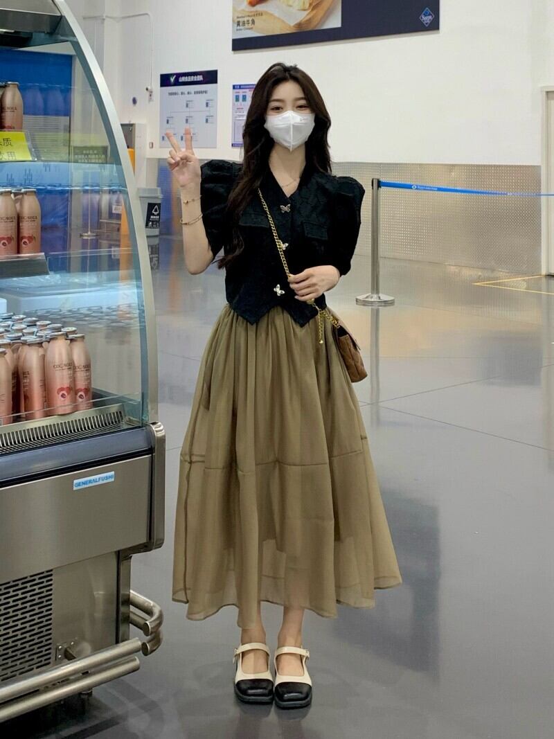 トップス スカート シャツ カットソー フレア ロング丈 袖あり 半袖 ボリューム袖 スリム かわいい 大人 蝶ボタン 可愛い きれいめ シンプル 大人 こなれ感 モダン 無地 春 夏 2点セット 20代 30代 40代 レディース 女性用 ビジネス OL 学生 デート お出かけ 公園デビュー 女子会 お泊まり 休日 ショッピング 着回し 普段使い お揃い コーデ スタイル サイズ M L XL 色展開 ブラック ベージュ