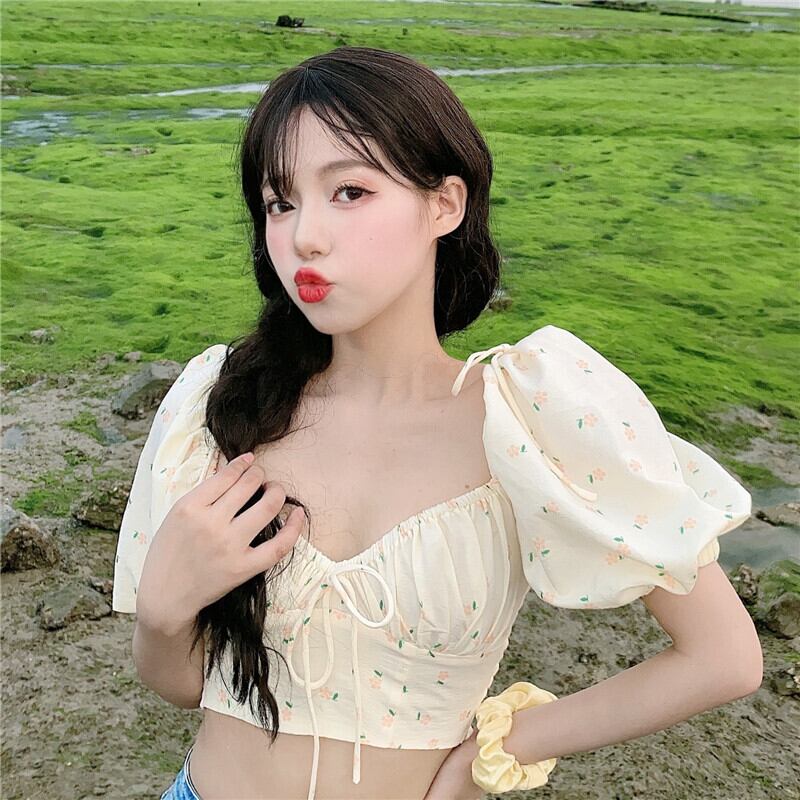 トップス シャツ ブラウス ミニ ミニ丈 ショート ショート丈 袖あり 半袖 パフスリーブ Vネック 襟なし スリム タイト 細身 リボン かわいい 大人可愛い シンプル カジュアル スポーティー ラブリー キュート ガーリー セクシー 花柄 小花柄 フラワー プリント 夏 誕生日 母の日 10代 20代 レディース 女性用 女の子 学生 通学 デート お出かけ 女子会 お泊まり 休日 アウトドア パーティー イベント リゾート 旅行 海 ショッピング 普段使い 韓国 韓国系 スタイル S M イエロー