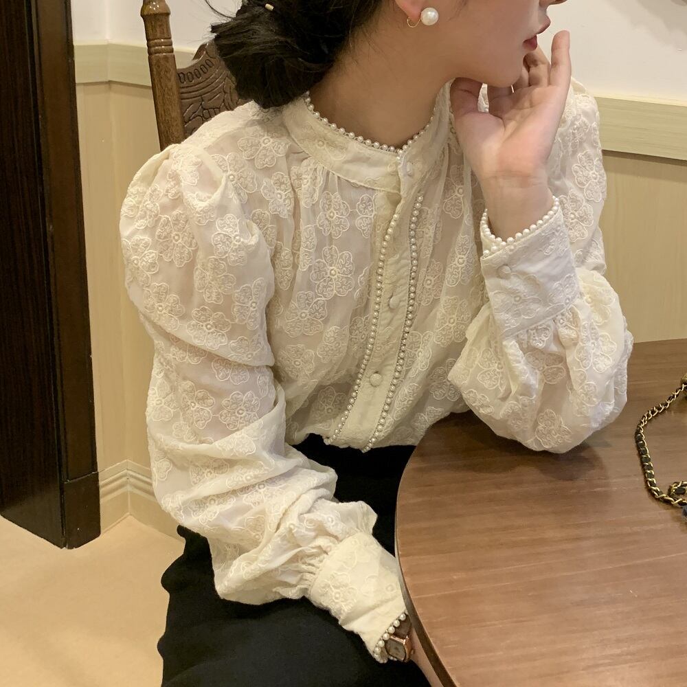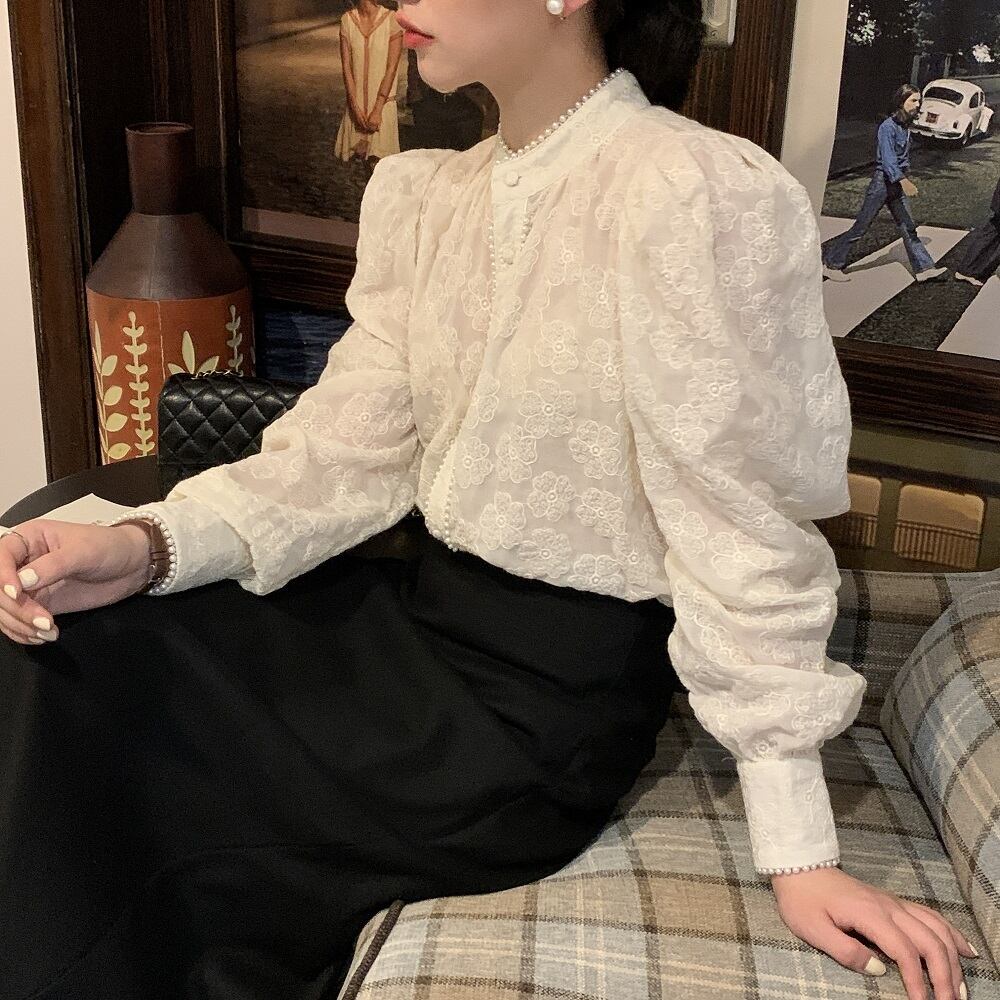 トップス ブラウス 袖あり 長袖 スタンドカラー レース 刺繍 フリル かわいい 大人可愛い きれいめ 上品 お洒落 大人女子 ラブリー キュート ガーリー エレガント 柄 花柄 小花柄 フラワー 春 秋 冬 誕生日 クリスマス バレンタイン 10代 20代 30代 40代 50代 60代 レディース 女性用 OL 学生 デート お出かけ 女子会 休日 イベント レストラン ショッピング 着回し 普段使い モテ ギフト インスタ映え サイズ フリーサイズ ワンサイズ 色展開 白 ホワイト