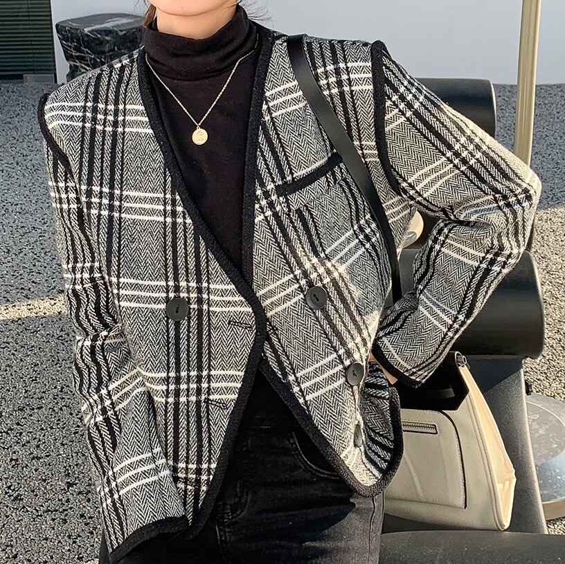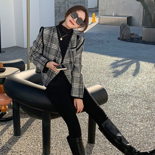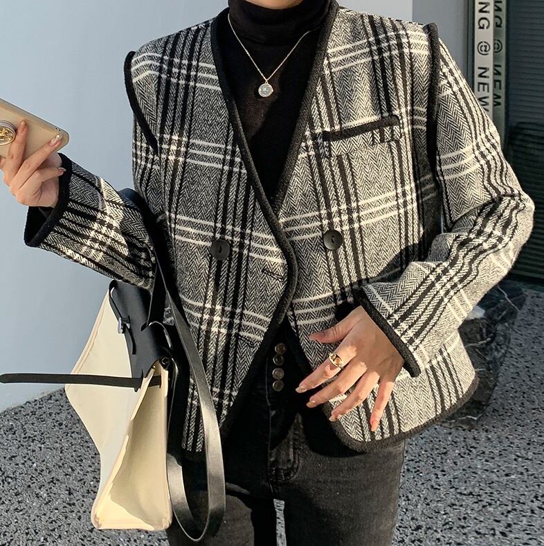 アウター ブルゾン スーツ 袖あり 長袖 Vネック 襟なし 前開き 大人可愛い 大人 上品 おしゃれ お洒落 レトロ エレガント チェック柄 格子柄 秋 冬 入学式 入園式 卒業式 卒園式 10代 20代 30代 40代 50代 60代 レディース 女性用 ママ デート お出かけ お泊まり 休日 パーティー イベント ホテル 着回し 普段使い 重ね着 お揃い プレゼント ギフト インスタ映え サイズ S M L XL フリーサイズ ワンサイズ 色展開 黒 ブラック