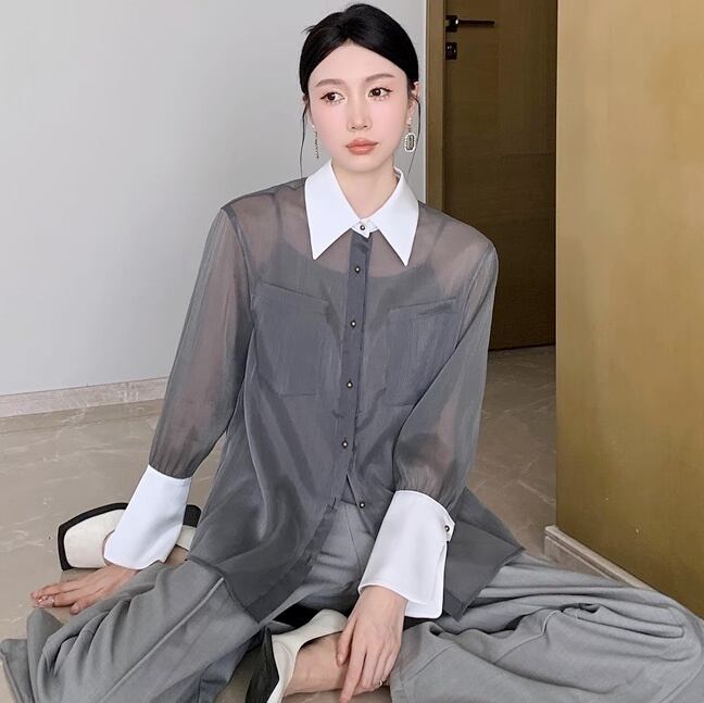 レディース トップス シャツ ブラウス 長袖 Vネック 襟付き 前開き 透け感 シースルー 切り替えデザイン 上品 おしゃれ かっこいい こなれ感 メンズライク マニッシュ ルーズ 個性的 クール モード系 エレガント モダン 主役級 存在感 抜け感 都会的 ラグジュアリー セクシー 無地 春 夏 秋 お出かけ パーティー イベント 海 レストラン ビーチ 女子会 休日 バカンス ライブ カフェ フェス 重ね着 楽ちん 普段使い 着回し トレンド 流行 インスタ映え S M L グレー ライトグレー
