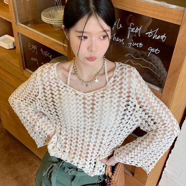レディース トップス カットソー 長袖 Uネック ラウンドネック クロシェ 編み込み 透け感 シースルー 大人可愛い おしゃれ こなれ感 ラフ ルーズ 個性的 クール 抜け感 キュート プレッピー カントリー アクティブ ナチュラル セクシー 無地 春 夏 秋 デート お出かけ パーティー イベント リゾート 旅行 海 女子会 休日 バカンス 高原 ガーデン ライブ フェス 重ね着 普段使い 着回し レイヤード モテ トレンド 流行 インスタ映え ゆったり ゆる フリーサイズ 白 ホワイト クリーム
