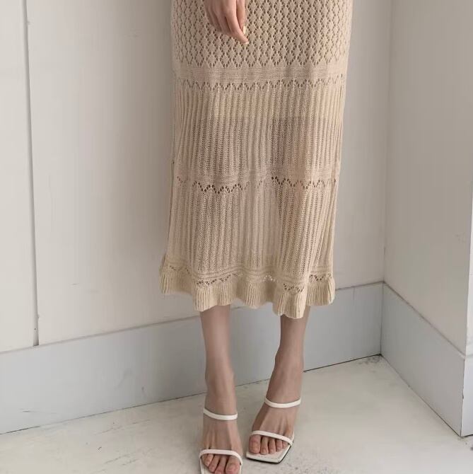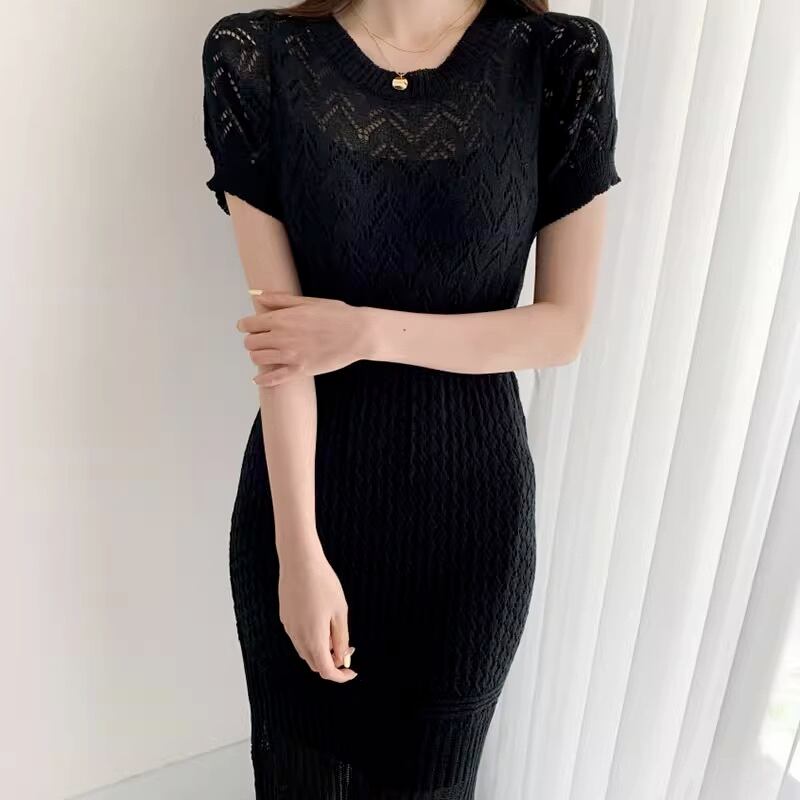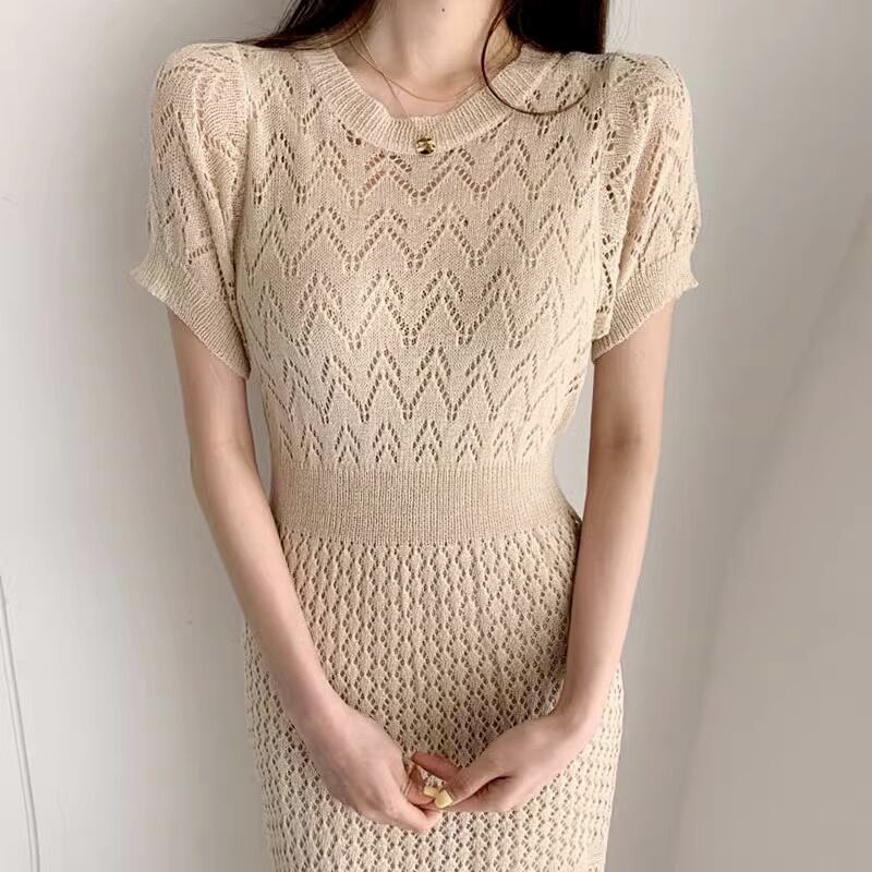 レディース ワンピース ミモレ ロング 半袖 Uネック ラウンドネック タイト スリム 細身 スマート フェミニン ウエストマーク クロシェ 透け感 シースルー 伸縮性 切り替えデザイン ニット 大人可愛い 上品 おしゃれ レトロ こなれ感 ラフ エレガント モダン ナチュラル 夏 母の日 お出かけ イベント リゾート 旅行 海 公園 女子会 休日 バカンス 高原 ホテル ガーデン カフェ コーデ 楽ちん 普段使い 着回し モテ トレンド 流行 フリーサイズ 黒 ブラック アプリコット ベーシックカラー