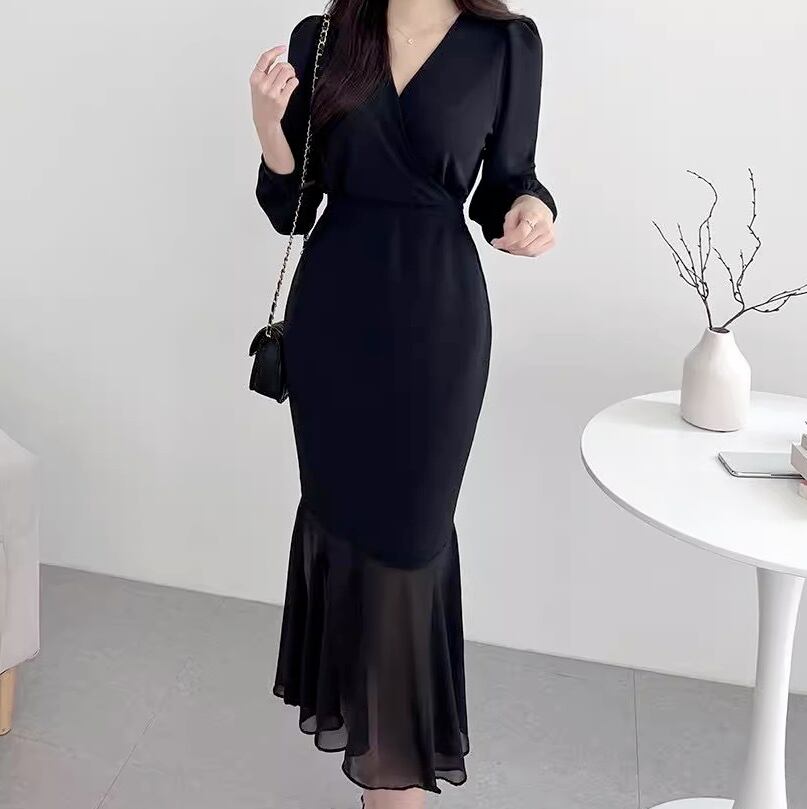 レディース ワンピース フレア ミモレ ロング 長袖 パフスリーブ Vネック カシュクール タイト マーメイド フェミニン ウエストマーク ハイウエスト 切り替えデザイン 大人可愛い きれいめ 上品 おしゃれ かっこいい レトロ こなれ感 モダン フォーマル 抜け感 都会的 セクシー 無地 春 秋 入学式 入園式 卒業式 卒園式 授業参観 ママ お出かけ イベント レストラン 休日 発表会 体型カバー 普段使い 着回し モテ 清楚 フリーサイズ 黒 ブラック アプリコット ベーシックカラー 大人カラー