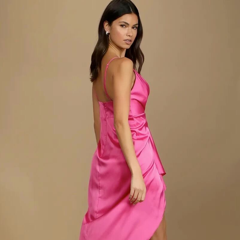 レディース ワンピース キャミワンピ ロング マキシ 9分丈 袖なし ノースリーブ Vネック アシンメトリー フェミニン プリーツ ウエストマーク ハイウエスト サテン シンプル おしゃれ かっこいい こなれ感 クール モード系 エレガント モダン 主役級 存在感 とろみ感 抜け感 都会的 ラグジュアリー ワイルド セクシー 無地 夏 お出かけ パーティー イベント リゾート 旅行 海 レストラン ビーチ 女子会 休日 バカンス 重ね着 コーデ モテ トレンド 流行 インスタ映え S M ピンク ネイビー