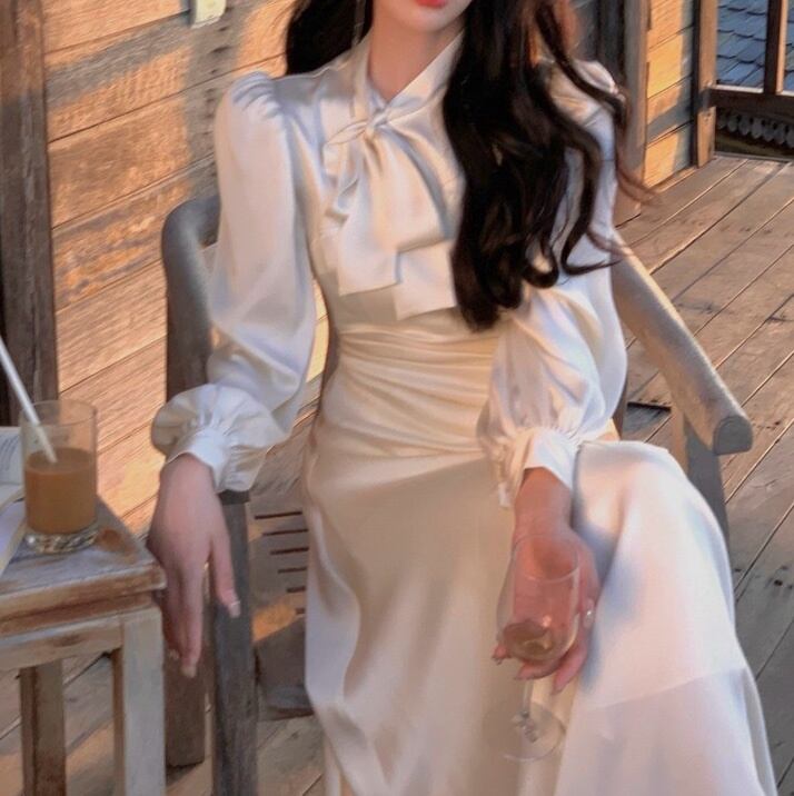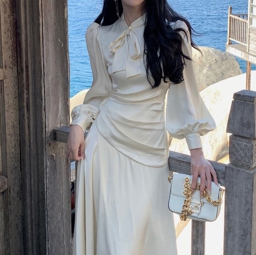 レディース ワンピース フレア ロング マキシ 長袖 ボリューム袖 パフスリーブ バルーン袖 Vネック りぼんタイ アシンメトリー フレア フェミニン リボン ウエストマーク ハイウエスト サテン 大人可愛い 上品 おしゃれ レトロ ガーリー エレガント モダン 主役級 存在感 フォーマル とろみ感 ヴィンテージ ラブリー キュート プリンセス ロマンティック 無地 春 秋 発表会 ママ お出かけ 休日 コンサート 普段使い モテ 清楚 XS S M L 小さいサイズ 大きいサイズ 白 ホワイト 光沢