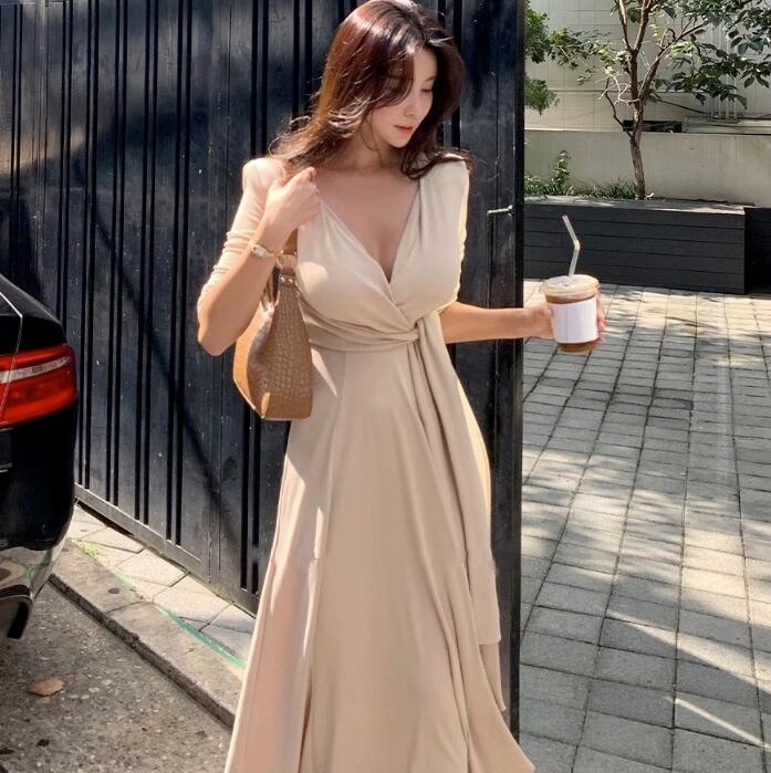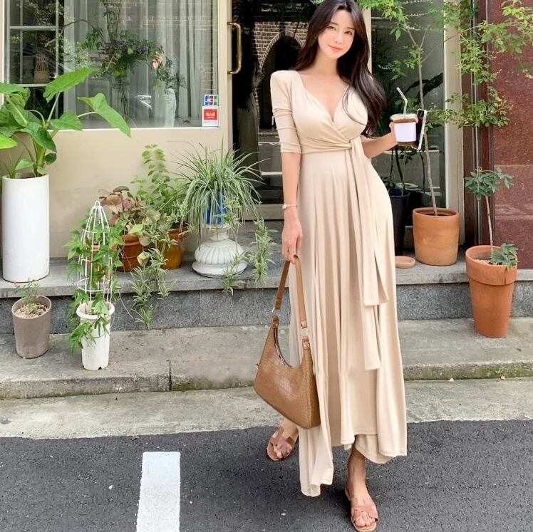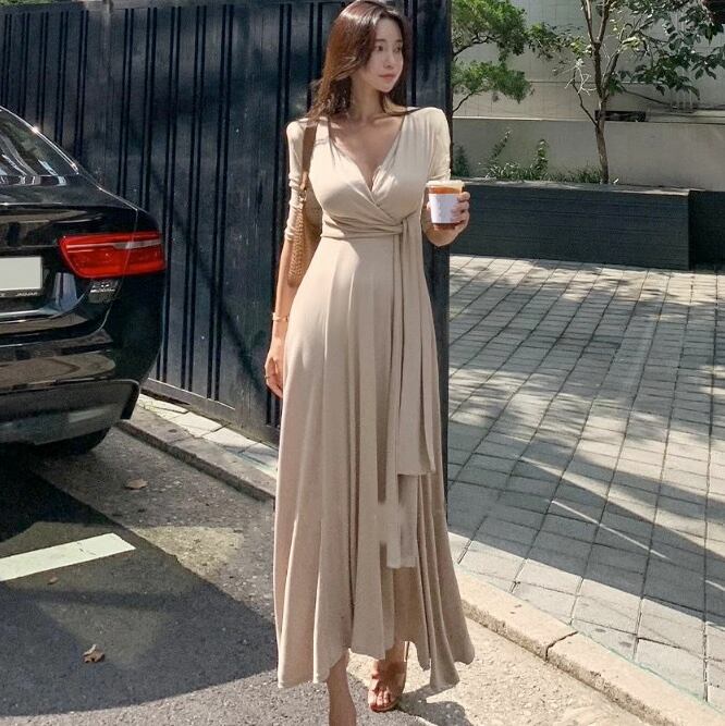 レディース ワンピース フレア ロング マキシ 長袖 Vネック カシュクール フレア Aライン ラップ フェミニン ウエストマーク ウエストリボン ハイウエスト 大人可愛い おしゃれ かっこいい こなれ感 ガーリー クール モード系 エレガント モダン 主役級 抜け感 ラブリー キュート ロマンティック セクシー 無地 春 秋 デート お出かけ パーティー イベント リゾート 女子会 休日 体型カバー 美脚 脚長 普段使い 着回し モテ インスタ映え フリーサイズ 黒 ブラック ベージュ ベーシックカラー