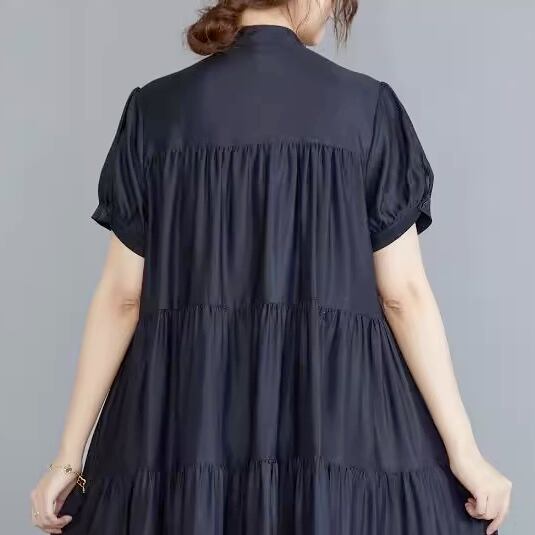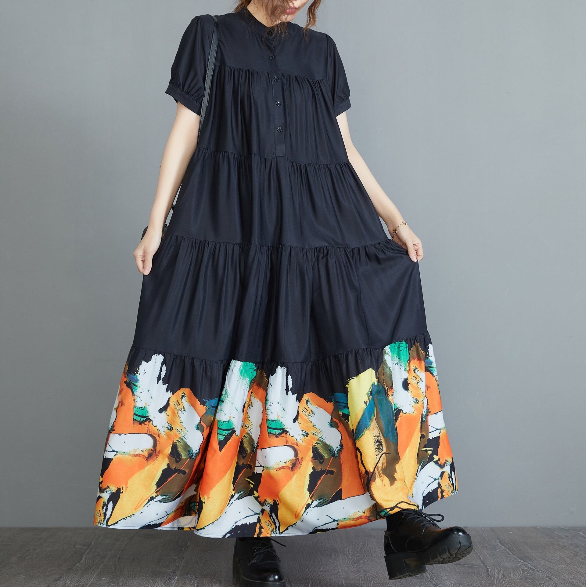 レディース ワンピース シャツワンピ フレア ティアード ロング マキシ 9分丈 半袖 Vネック 襟付き スキッパー フレア フェミニン ストリート 薄手 かわいい 大人可愛い カジュアル 上品 おしゃれ レトロ こなれ感 ラフ ガーリー ルーズ 抜け感 キュート ナチュラル プリント 春 夏 ママ マタニティ お出かけ 旅行 公園 女子会 休日 ショッピング カフェ フェス 楽ちん 体型カバー 普段使い 着回し トレンド 流行 インスタ映え L XL 大きいサイズ ビッグ ゆったり ゆる 黒 ブラック
