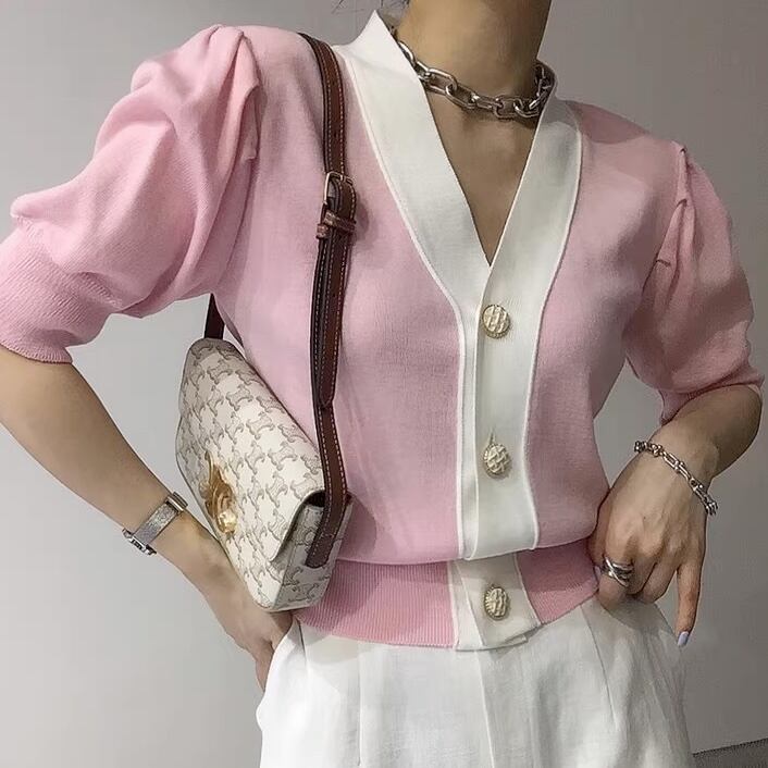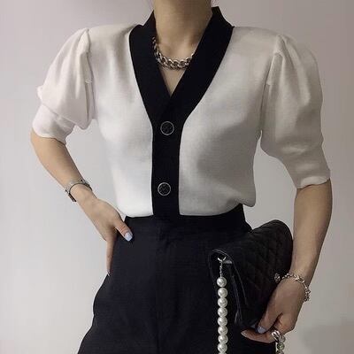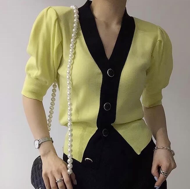 トップス ニット カーディガン レディース 5分袖 ボリューム袖 Vネック フォーマル フェミニン 前開き コンサバ バイカラー 大人可愛い きれいめ 上品 おしゃれ レトロ こなれ感 ガーリー クール エレガント モダン フォーマル 抜け感 ラブリー キュート 都会的 クラシカル ベーシック ロマンティック ナチュラル 無地 春 夏 秋 OL デート お出かけ 女子会 休日 合コン コンパ カフェ 重ね着 楽ちん モテ 清楚 インスタ映え フリーサイズ 白 ホワイト 黒 ブラック 黄色 イエロー ピンク