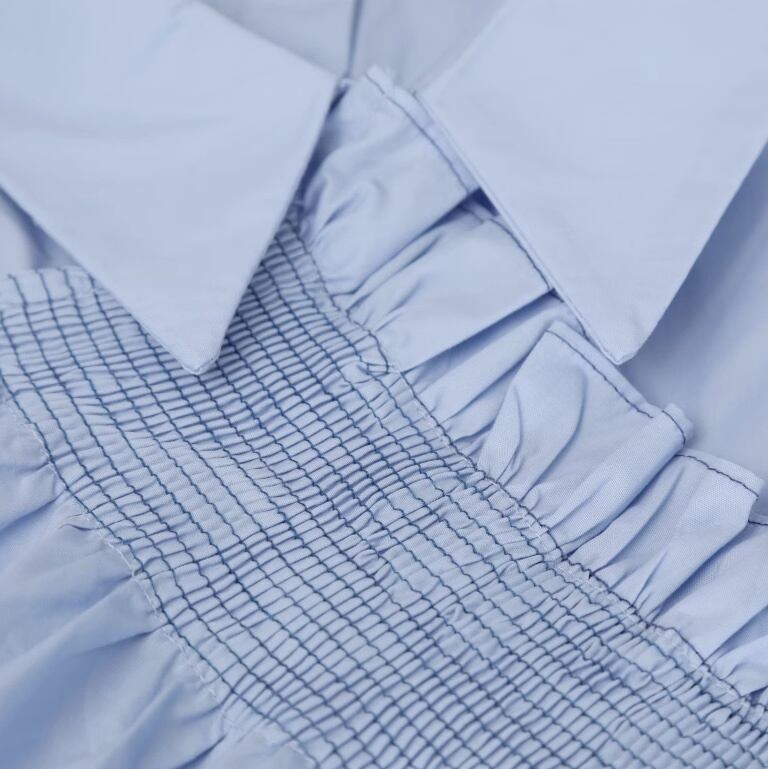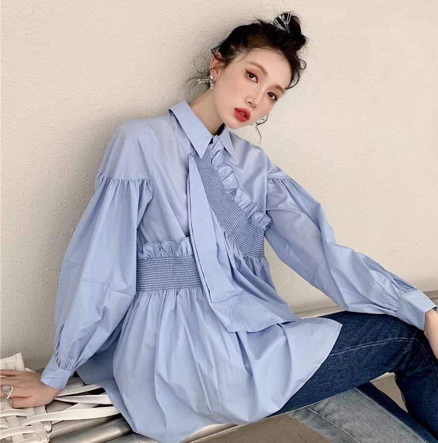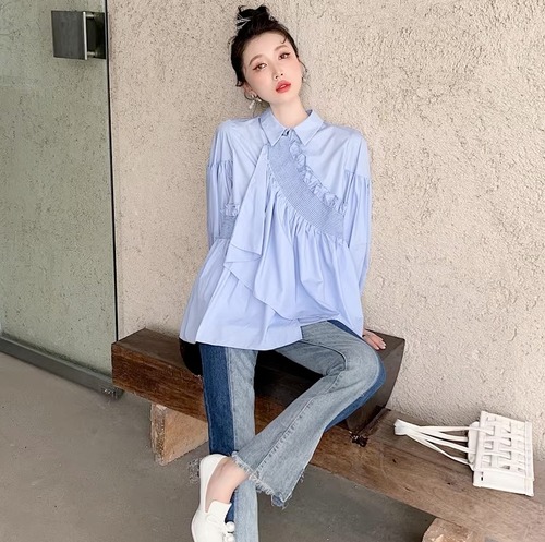 トップス シャツ ブラウス 長袖 Vネック 襟付き アシンメトリー 切り替え オーバーサイズ フェミニン プリーツ フリル ギャザー 大人可愛い おしゃれ かっこいい ガーリー ルーズ 個性的 クール モード系 主役級 存在感 ラブリー キュート 都会的 ラグジュアリー ロマンティック 無地 春 秋 デート お出かけ パーティー イベント 女子会 休日 ショッピング ライブ カフェ コーデ 体型カバー 普段使い 着回し レイヤード トレンド 流行 インスタ映え S M ゆったり ゆる 水色 ブルー