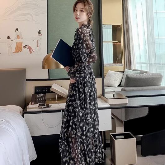 ワンピース フレア ロング マキシ 9分丈 長袖 Vネック Aライン フェミニン シフォン フリル ウエストマーク ハイウエスト 透け感 シースルー 薄手 かわいい 大人可愛い シンプル おしゃれ ガーリー エレガント 抜け感 ラブリー キュート ベーシック ロマンティック ナチュラル 花柄 フラワー 春 秋 デート お出かけ イベント 公園 女子会 休日 ショッピング お花見 カフェ コーデ 楽ちん 体型カバー 普段使い 着回し モテ 清楚 S M L XL 小さいサイズ 大きいサイズ 黒 ブラック