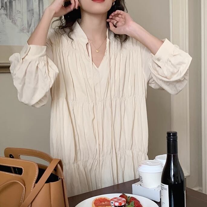 ワンピース シャツワンピ ティアード マキシ 9分丈 長袖 Vネック 襟付き ストレート フェミニン リボン かわいい 大人可愛い シンプル カジュアル おしゃれ こなれ感 ラフ ガーリー ルーズ 抜け感 ラブリー キュート ベーシック カントリー ロマンティック ナチュラル 無地 春 秋 ママ マタニティ 公園 女子会 休日 ショッピング カフェ フェス 楽ちん 体型カバー 普段使い 着回し モテ 清楚 トレンド 流行 インスタ映え ゆったり ゆる フリーサイズ 白 ホワイト 水色 ブルー 春カラー