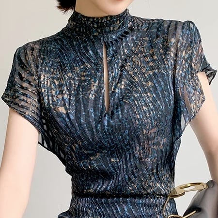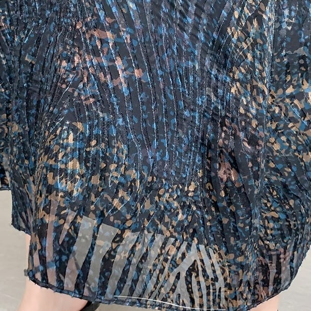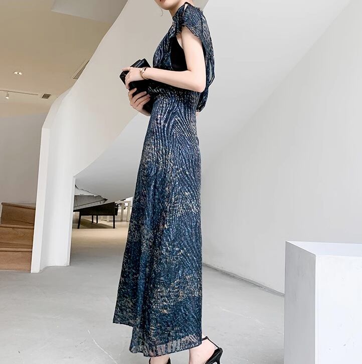 ワンピース フレア マキシ 9分丈 半袖 ハイネック フレア Aライン 切り替え 背中開き フェミニン プリーツ ウエストマーク バックコンシャス 透け感 シースルー ヴィンテージ 薄手 かわいい 大人可愛い 上品 おしゃれ 個性的 クール モード系 都会的 マーブル 総柄 春 秋 謝恩会 結婚式 二次会 披露宴 発表会 ママ お出かけ パーティー イベント 海 レストラン ビーチ 休日 バカンス カフェ 体型カバー 美脚 脚長 着回し インスタ映え S M L 小さいサイズ 大きいサイズ ブルー 青色