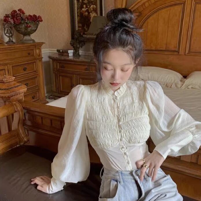 トップス シャツ ブラウス レディース 長袖 ボリューム袖 パフスリーブ バルーン袖 スタンドカラー タイト スリム 細身 フェミニン フリル 透け感 シースルー ボタン ギャザー 伸縮性 かわいい 大人可愛い おしゃれ レトロ 個性的 エレガント モダン ヴィンテージ ラブリー キュート ロリータ プリンセス クラシカル ロマンティック 無地 春 秋 デート お出かけ イベント 女子会 休日 重ね着 着回し モテ トレンド 流行 インスタ映え S M L XL 小さいサイズ 大きいサイズ 白 ホワイト