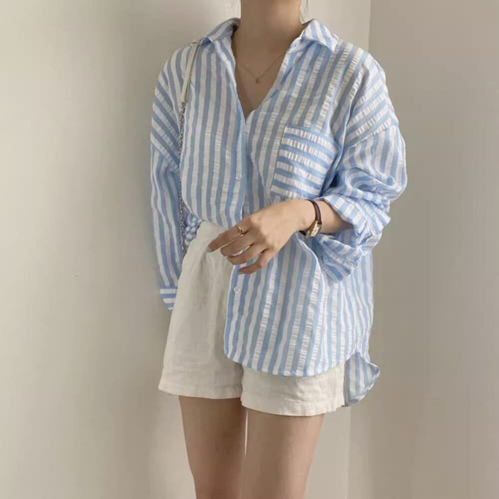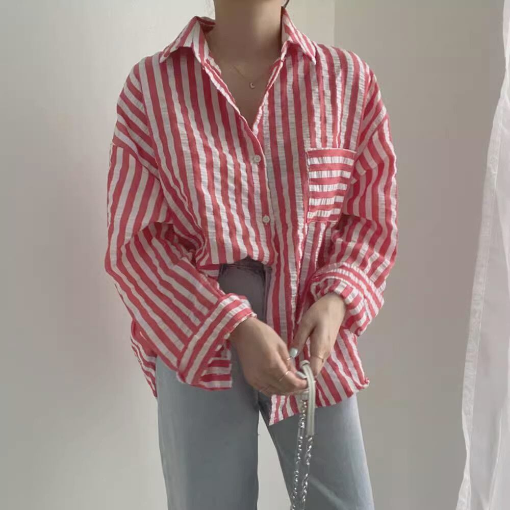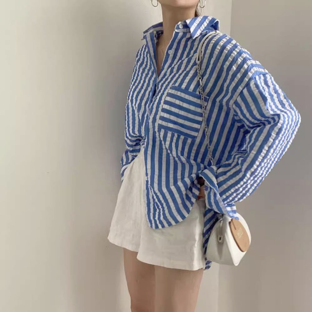 トップス シャツ ブラウス レディース 長袖 Vネック 襟付き 薄手 シンプル カジュアル おしゃれ こなれ感 ラフ メンズライク マニッシュ ボーイッシュ スポーティー ガーリー ルーズ 抜け感 キュート ベーシック カントリー ナチュラル ボーダー ストライプ 春 秋 学生 学校 通学 お出かけ 旅行 女子会 休日 カフェ お揃い 双子 楽ちん 体型カバー 普段使い 着回し モテ 清楚 トレンド 流行 インスタ映え 定番 ゆったり ゆる フリーサイズ 水色 ブルー レッド ライトブルー 春カラー
