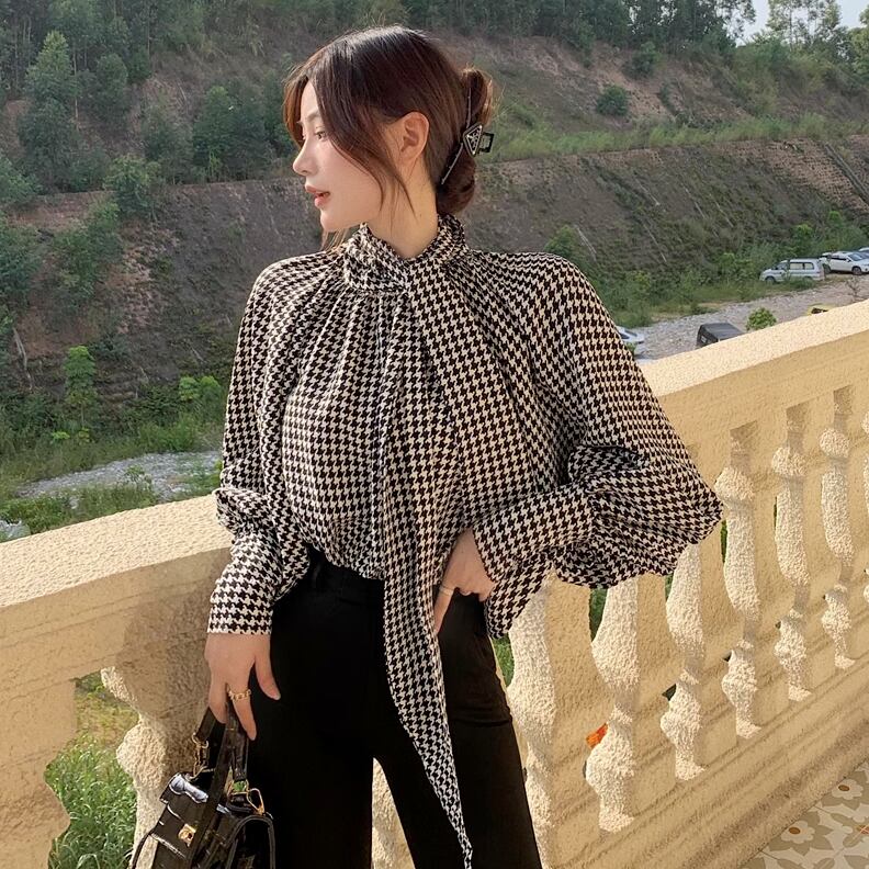 トップス シャツ ブラウス レディース 長袖 ボリューム袖 Vネック りぼんタイ フェミニン かわいい 大人可愛い きれいめ 上品 おしゃれ かっこいい レトロ ガーリー エレガント ラブリー キュート クラシカル ロマンティック ナチュラル チェック 格子柄 千鳥格子 春 秋 デート お出かけ イベント 女子会 休日 ショッピング カフェ モノトーン 重ね着 体型カバー 普段使い 着回し レイヤード モテ トレンド 流行 インスタ映え S M 小さいサイズ 大きいサイズ 黒 ブラック ベーシックカラー