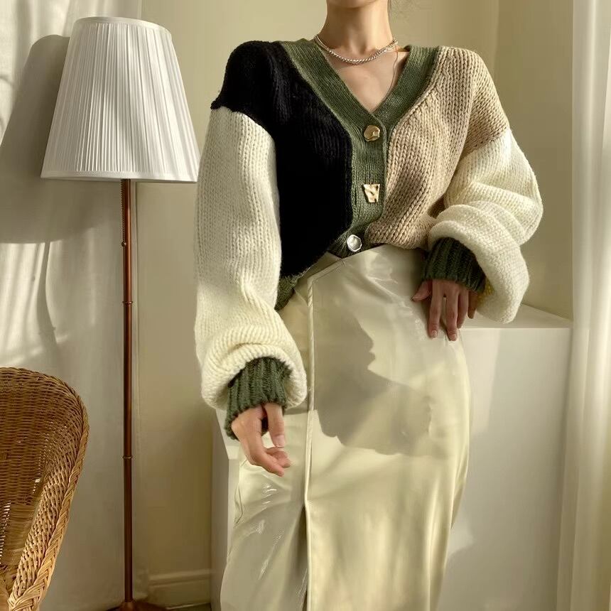 トップス ニット カーディガン レディース 長袖 Vネック ストリート 前開き ボタン バイカラー 配色 ニット かわいい 大人可愛い カジュアル おしゃれ レトロ こなれ感 ラフ ガーリー ルーズ 個性的 クール ラブリー キュート カレッジ風 学生風 プレッピー カントリー アクティブ 秋 冬 お出かけ 公園 女子会 休日 ショッピング カフェ 重ね着 暖かい 防寒 普段使い 着回し レイヤード トレンド 流行 インスタ映え ゆったり ゆる フリーサイズ 黒 ブラック 茶色 ブラウン 緑 グリーン