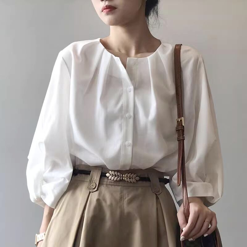 トップス シャツ ブラウス レディース 7分袖 Uネック ラウンドネック ノーカラー フェミニン タック タックプリーツ コンサバ 薄手 かわいい 大人可愛い きれいめ シンプル 上品 おしゃれ こなれ感 ラフ ガーリー ベーシック カントリー ナチュラル 無地 春 秋 デート お出かけ イベント 旅行 公園 女子会 休日 高原 ガーデン ショッピング お花見 カフェ 重ね着 普段使い 着回し レイヤード モテ 清楚 トレンド 流行 インスタ映え M L 小さいサイズ 大きいサイズ 白 ホワイト ベージュ