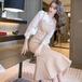 ワンピース レディース 膝下 長袖 ボリューム袖 Vネック タイト スリム マーメイド フィッシュテール フェミニン ウエストマーク 透け感 シースルー 切り替えデザイン ドッキング 異素材ミックス かわいい 大人可愛い きれいめ シンプル おしゃれ ガーリー エレガント モダン 抜け感 キュート 無地 春 秋 デート お出かけ レストラン 女子会 休日 カフェ 体型カバー 美脚 脚長 普段使い 着回し モテ 清楚 トレンド 流行 インスタ映え S M L XL 小さいサイズ 大きいサイズ ベージュ