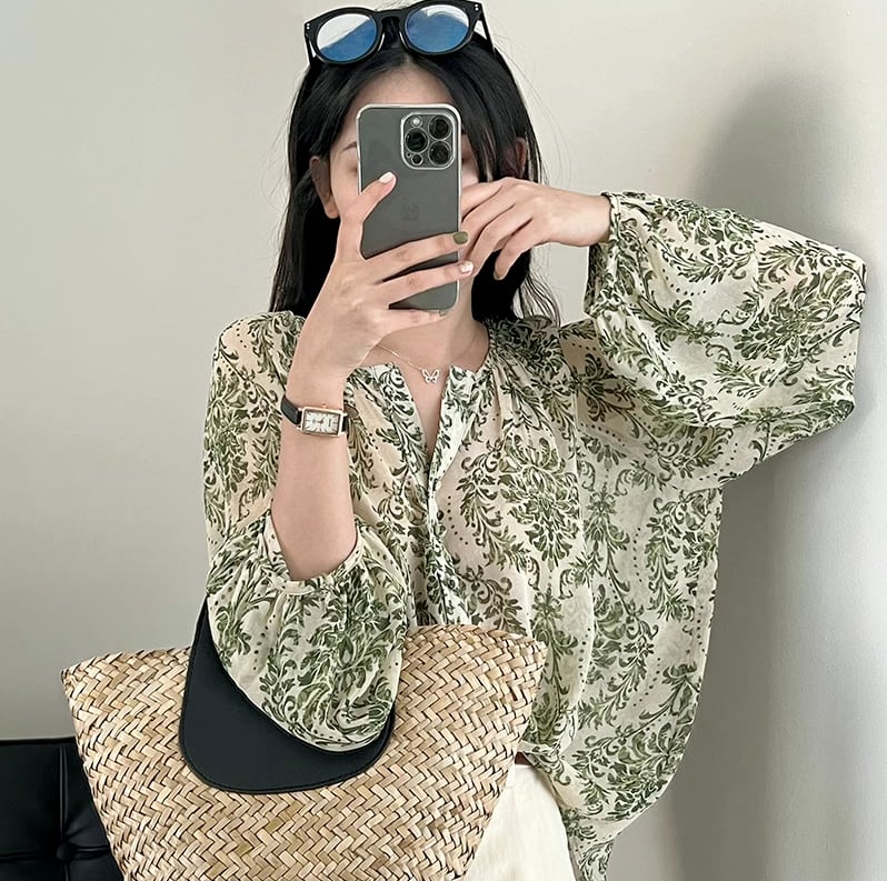 トップス シャツ ブラウス レディース 長袖 ボリューム袖 Vネック 透け感 シースルー アメカジ かわいい 大人可愛い カジュアル おしゃれ レトロ アジアン エスニック エキゾチック こなれ感 抜け感 ラブリー キュート アクティブ ナチュラル ワイルド リーフ ボタニカル 総柄 春 秋 お出かけ リゾート 旅行 海 レストラン ビーチ 女子会 休日 ショッピング カフェ 重ね着 体型カバー 普段使い 着回し レイヤード トレンド 流行 インスタ映え M L 小さいサイズ 大きいサイズ 緑 グリーン