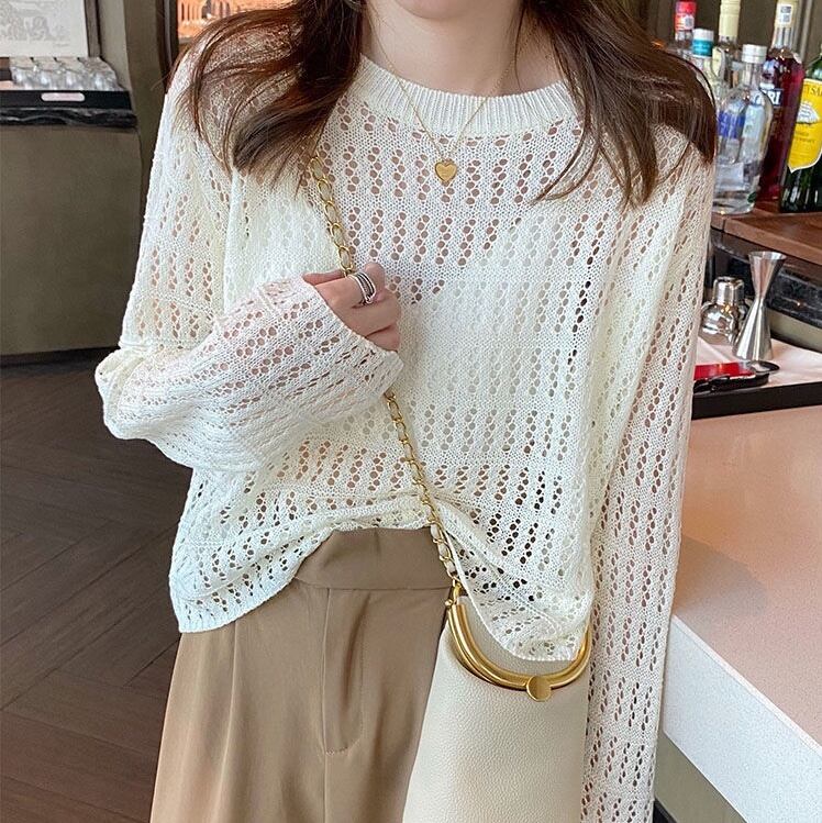 トップス ニット レディース 長袖 Uネック ラウンドネック フェミニン 透け感 シースルー 薄手 ニット かわいい 大人可愛い きれいめ シンプル 上品 おしゃれ かっこいい レトロ ラフ ガーリー ルーズ ラブリー キュート ベーシック ナチュラル 無地 春 夏 秋 お出かけ 旅行 女子会 休日 ショッピング カフェ 重ね着 楽ちん 普段使い 着回し レイヤード モテ 清楚 トレンド 流行 インスタ映え 定番 フリーサイズ 白 ホワイト 黒 ブラック 茶色 ブラウン アプリコット ベーシックカラー