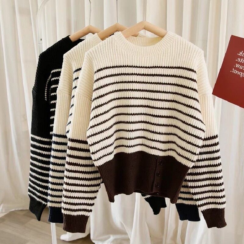 トップス ニット セーター 長袖 ラウンドネック フェミニン ストリート ハイウエスト ボタン ニット リブニット かわいい 大人可愛い きれいめ シンプル 上品 おしゃれ こなれ感 ラフ ガーリー クール モード系 ラブリー キュート カントリー アクティブ ナチュラル ボーダー 秋 冬 デート お出かけ レストラン 女子会 休日 カフェ 重ね着 暖かい 防寒 普段使い 着回し レイヤード モテ 清楚 トレンド 流行 インスタ映え ゆったり ゆる フリーサイズ 白 ホワイト 黒 ブラック 茶色 ブラウン