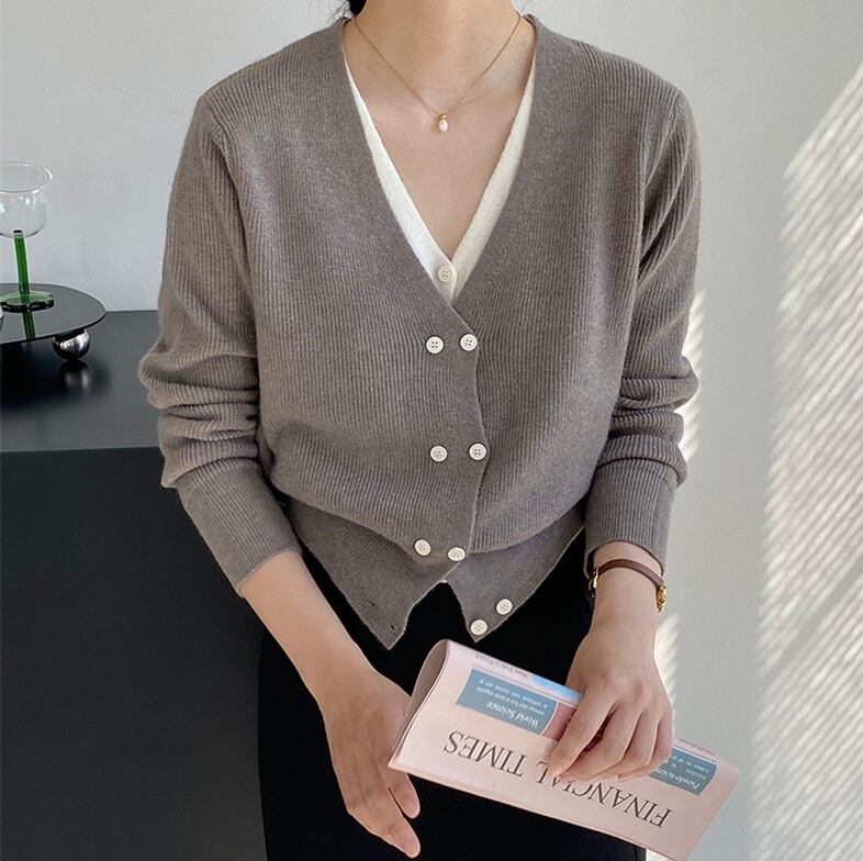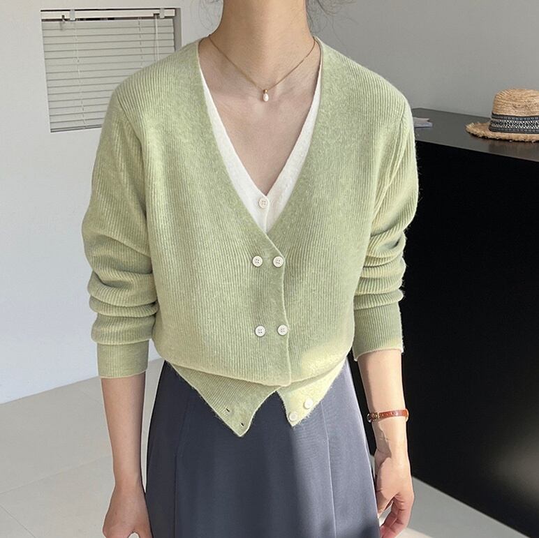 トップス ニット セーター レディース 長袖 Vネック フェミニン ボタン 切り替えデザイン ドッキング ニット かわいい 大人可愛い きれいめ 上品 おしゃれ かっこいい ガーリー 抜け感 ラブリー キュート ベーシック 無地 春 秋 オフィス ビジネス OL 通勤 デート お出かけ イベント 旅行 公園 女子会 休日 ショッピング カフェ 重ね着 コーデ 楽ちん 暖かい 防寒 体型カバー 普段使い 着回し レイヤード 清楚 トレンド 流行 インスタ映え 定番 フリーサイズ グレー ピンク 緑 グリーン