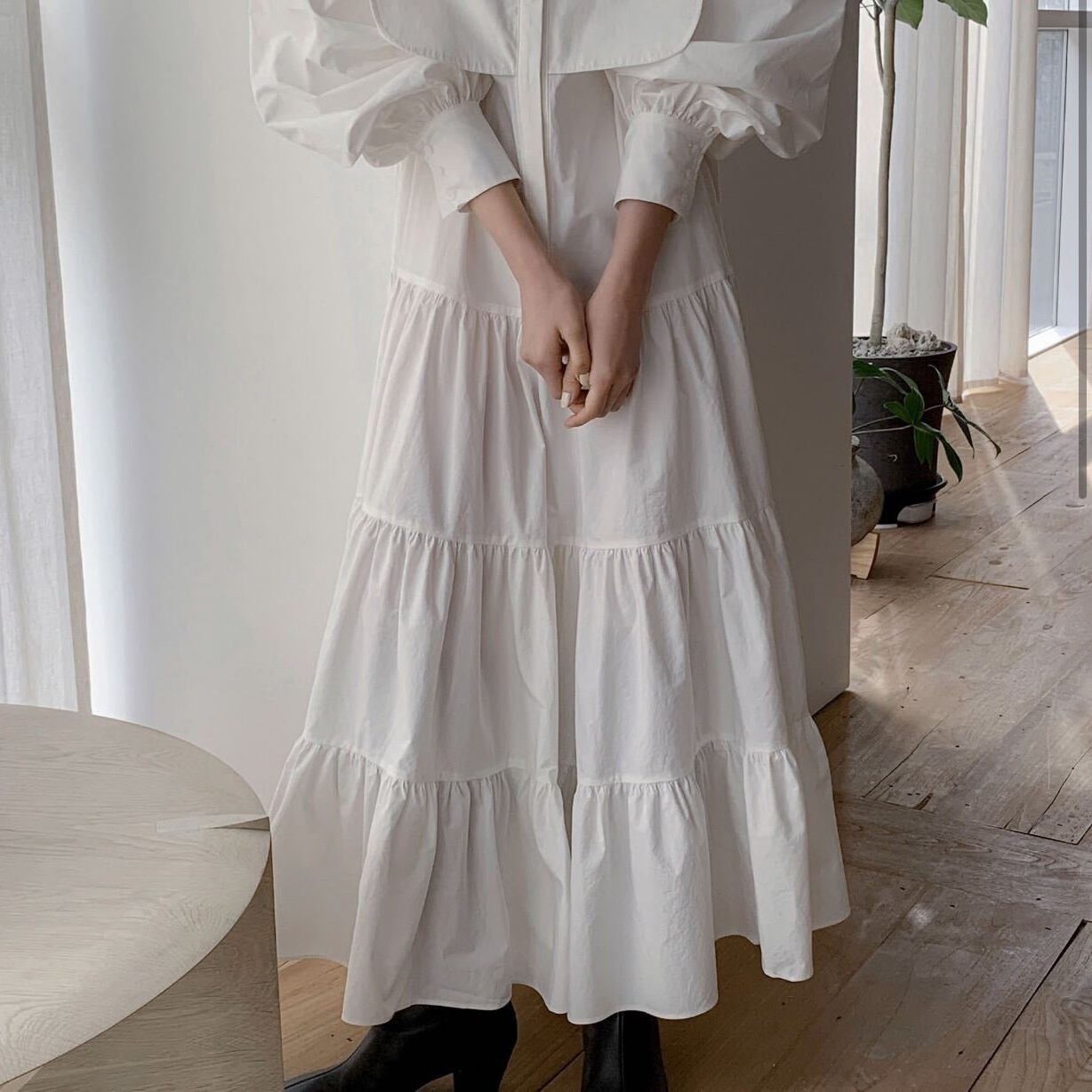 ワンピース レディース ティアード マキシ 長袖 ボリューム袖 セーラーカラー Aライン フェミニン ウエストマーク オーバーサイズ かわいい 大人可愛い きれいめ シンプル 上品 おしゃれ かっこいい ガーリー ルーズ 個性的 モード系 エレガント モダン キュート 都会的 ロマンティック ナチュラル 無地 春 秋 デート お出かけ パーティー イベント 女子会 休日 バカンス ショッピング ライブ カフェ 体型カバー 普段使い 着回し レイヤード トレンド フリーサイズ 白 水色 ブルー パステル