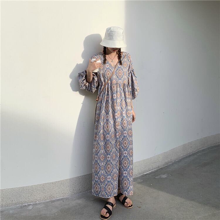 ワンピース レディース フレア マキシ 7分袖 ボリューム袖 Vネック フレア Aライン フェミニン ストリート ハイウエスト かわいい 大人可愛い きれいめ シンプル 上品 おしゃれ かっこいい レトロ アジアン エスニック こなれ感 ラフ ガーリー キュート プレッピー カントリー 総柄 春 夏 デート お出かけ イベント 女子会 休日 ショッピング コンサート ライブ カフェ 重ね着 コーデ 楽ちん 体型カバー 脚長 普段使い 着回し トレンド 流行 インスタ映え フリーサイズ オレンジ ネイビー