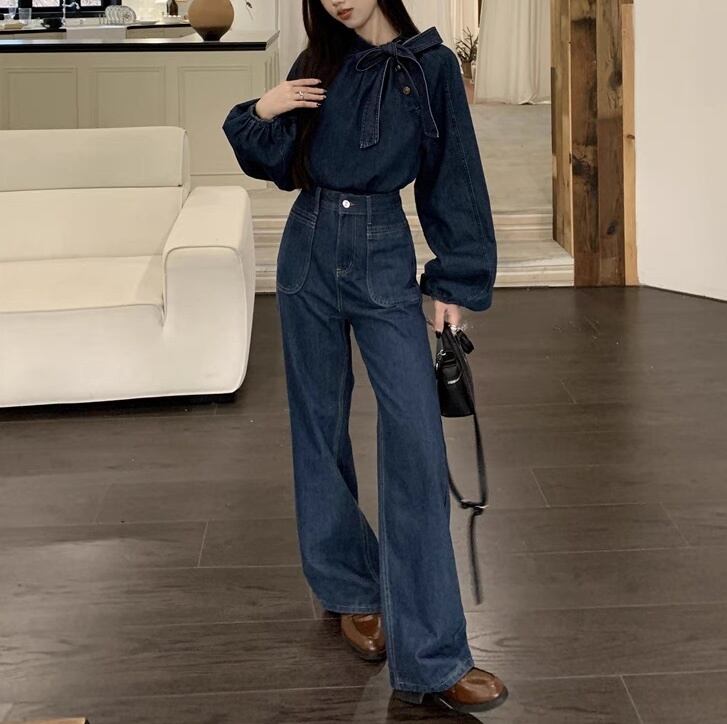 上下セット 2点セット トップス パンツ ボトムス デニム ロングパンツ フルレングス 長袖 バルーン袖 りぼんタイ ワイド ストレート フェミニン ハイウエスト リボン ポケット ブルーデニム かわいい 大人可愛い きれいめ カジュアル おしゃれ かっこいい レトロ こなれ感 クール 抜け感 ラブリー キュート アクティブ ロマンティック ワイルド 無地 春 秋 お出かけ イベント 女子会 休日 ショッピング コンサート ライブ カフェ 美脚 脚長 トレンド 流行 インスタ映え S M L ネイビー